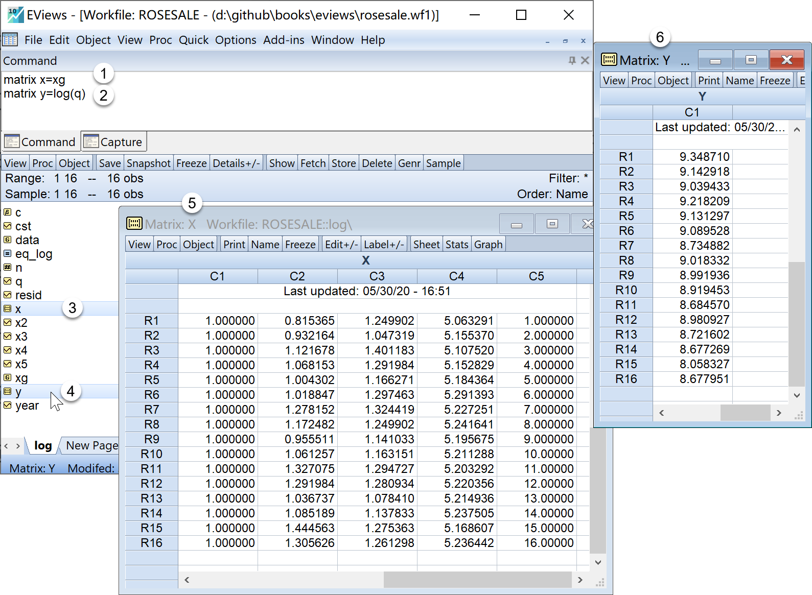 (4)关于对数线性模型 式 4.58 ,在Eviews中运用矩阵方法,计算如下步骤: