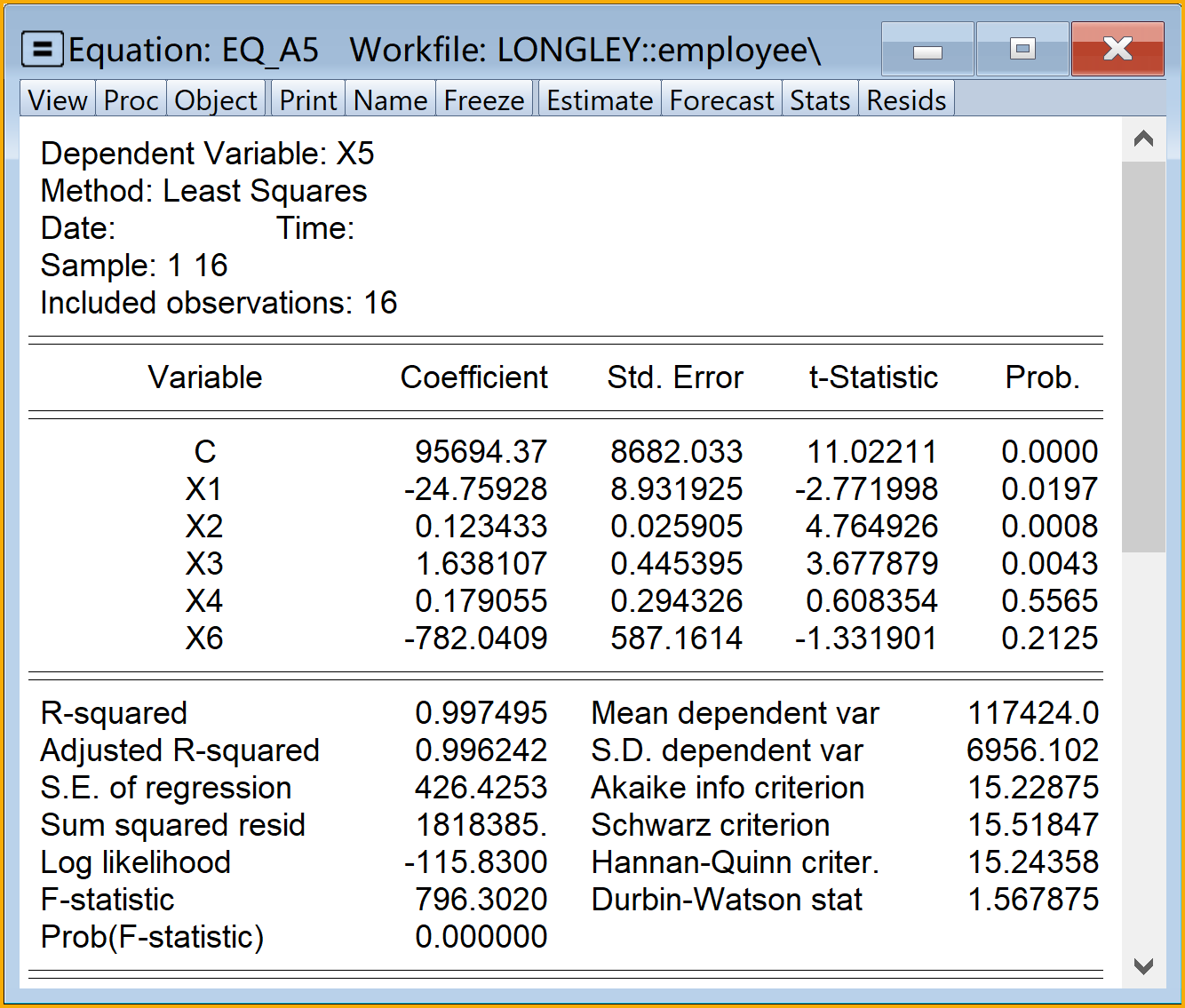 \[ \begin{alignedat}{999} \begin{split} &\widehat{Y}=&&+74169.53&&-0.04X2_i&&-2.09X3_i\\ &(s)&&(4251.5849)&&(0.0165)&&(0.2900)\\ &(t)&&(+17.45)&&(-2.44)&&(-7.20)\\ &(cont.)&&-1.01X4_i&&+1887.41X6_i &&\\ &(s)&&(0.1837)&&(382.7665) &&\\ &(t)&&(-5.52)&&(+4.93) &&\\ &(over)&&n=16&&\hat{\sigma}=279.3955 &&\\ &(fit)&&R^2=0.9954&&\bar{R}^2=0.9937 &&\\ &(Ftest)&&F^*=589.76&&p=0.0000 && \end{split} \end{alignedat} \tag{5.42}\]