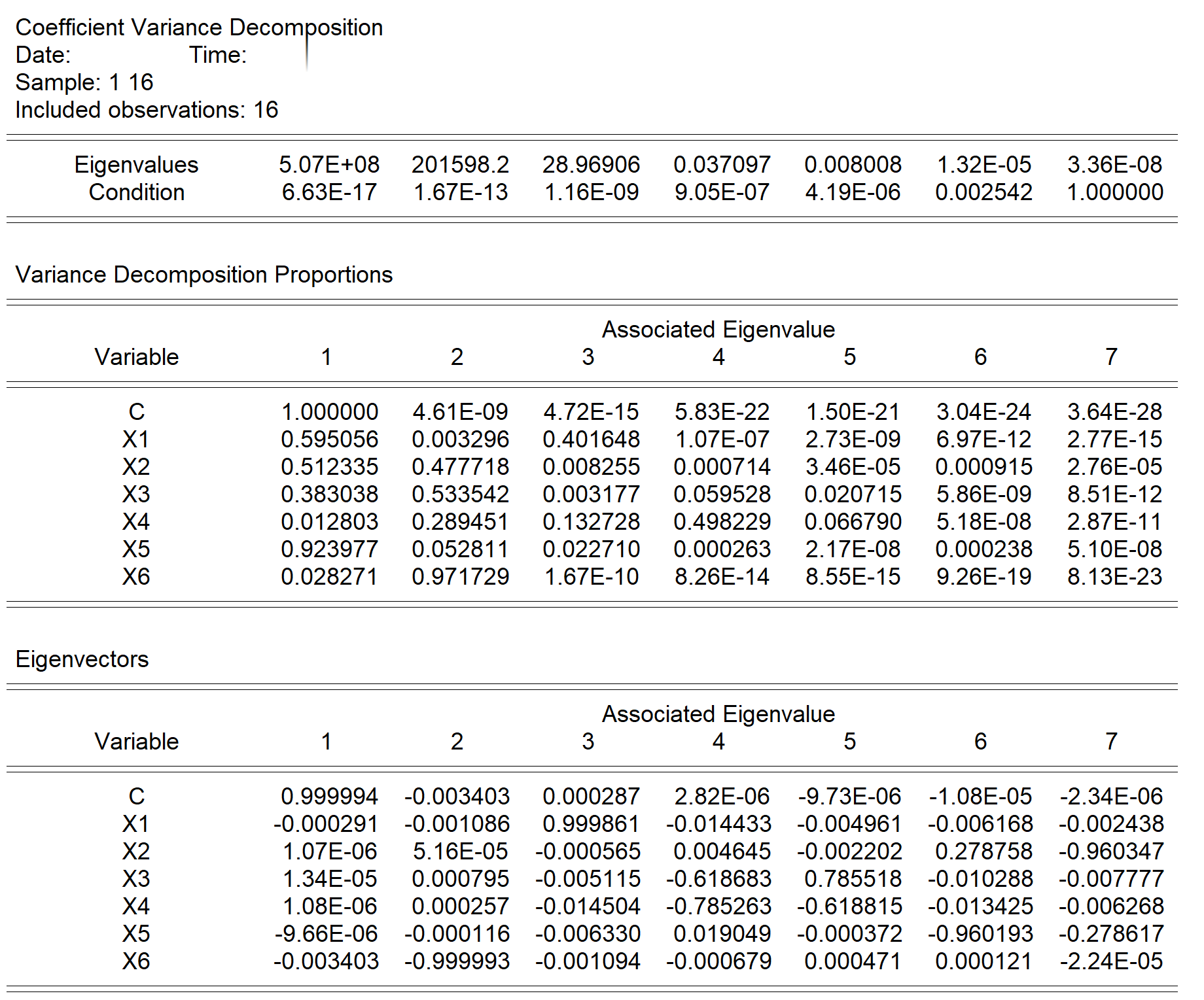 (4)利用回归系数方差分解法(Coefficient Variance Decomposition)。通过计算特征值(eigenvalues),进而得到病态数(\(K_j\))和方差分解比率\(VDP_j\),最后做出多重共线性的诊断结论: