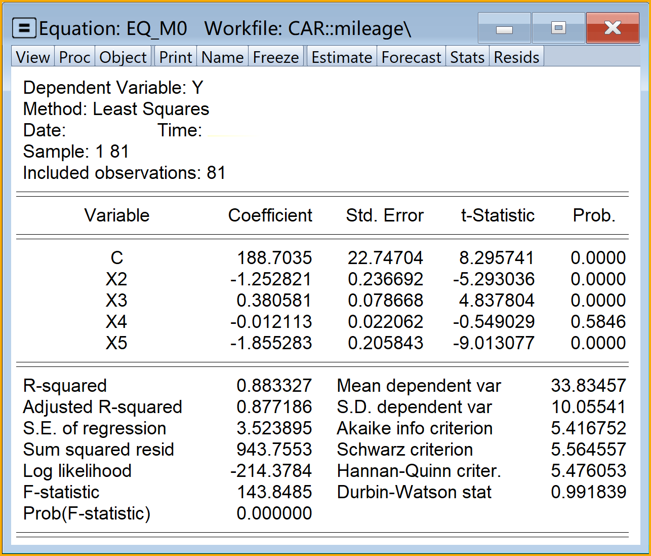 - 方程设置(Equation Specification): 输入变量Y c X2 X3 X4 X5
