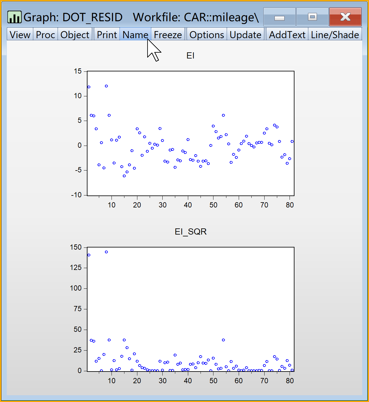 残差\(e_i^2\)的描点图(dot plot),如果表现为线性增加的图形模式,则表明随机干扰项的方差单调增加。