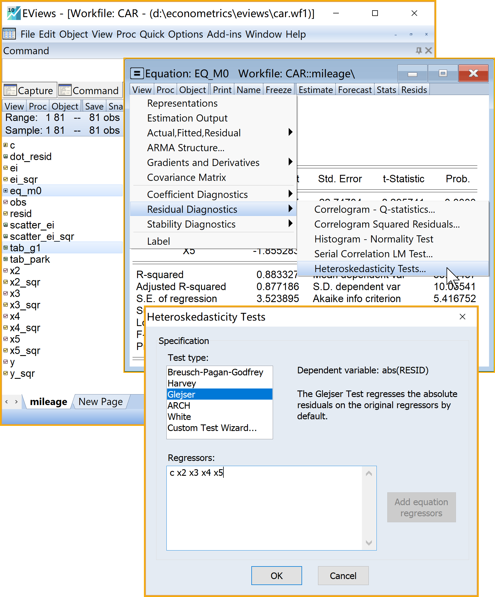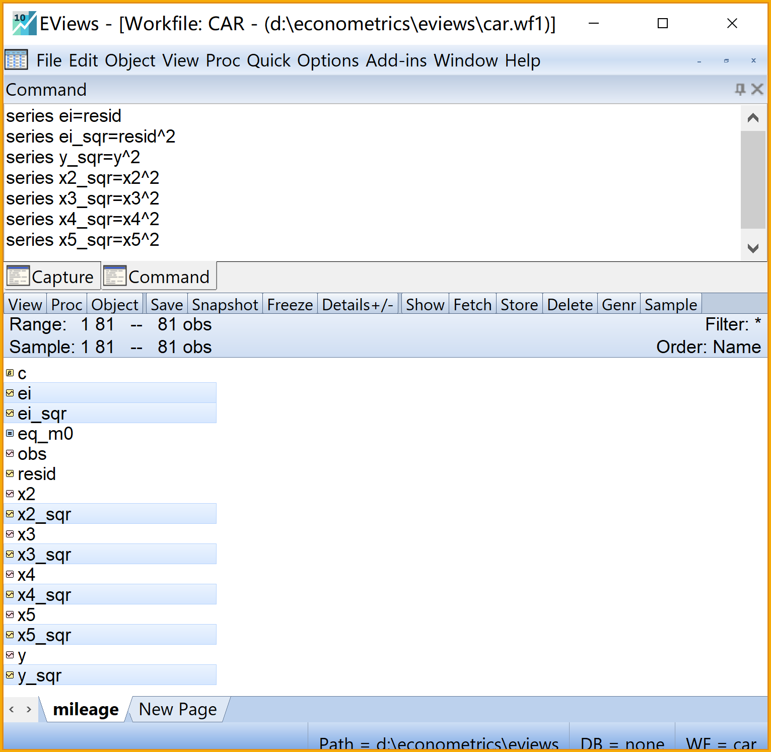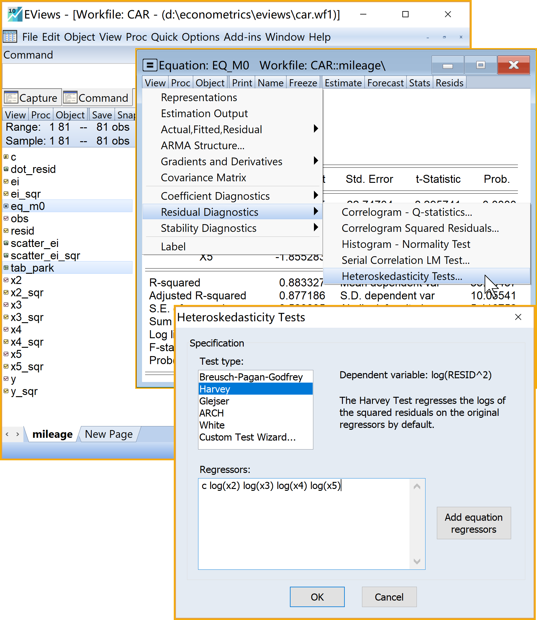 \[ \begin{aligned} e^2_i & =\hat{\alpha}_1+\hat{\alpha}_2X_{2i}+\hat{\alpha}_3X_{3i}+\hat{\alpha}_4X^2_{2i}+\hat{\alpha}_5X^2_{3i}+\hat{\alpha}_6X_{2i}X_{3i}+v_i \end{aligned} \tag{6.34}\]