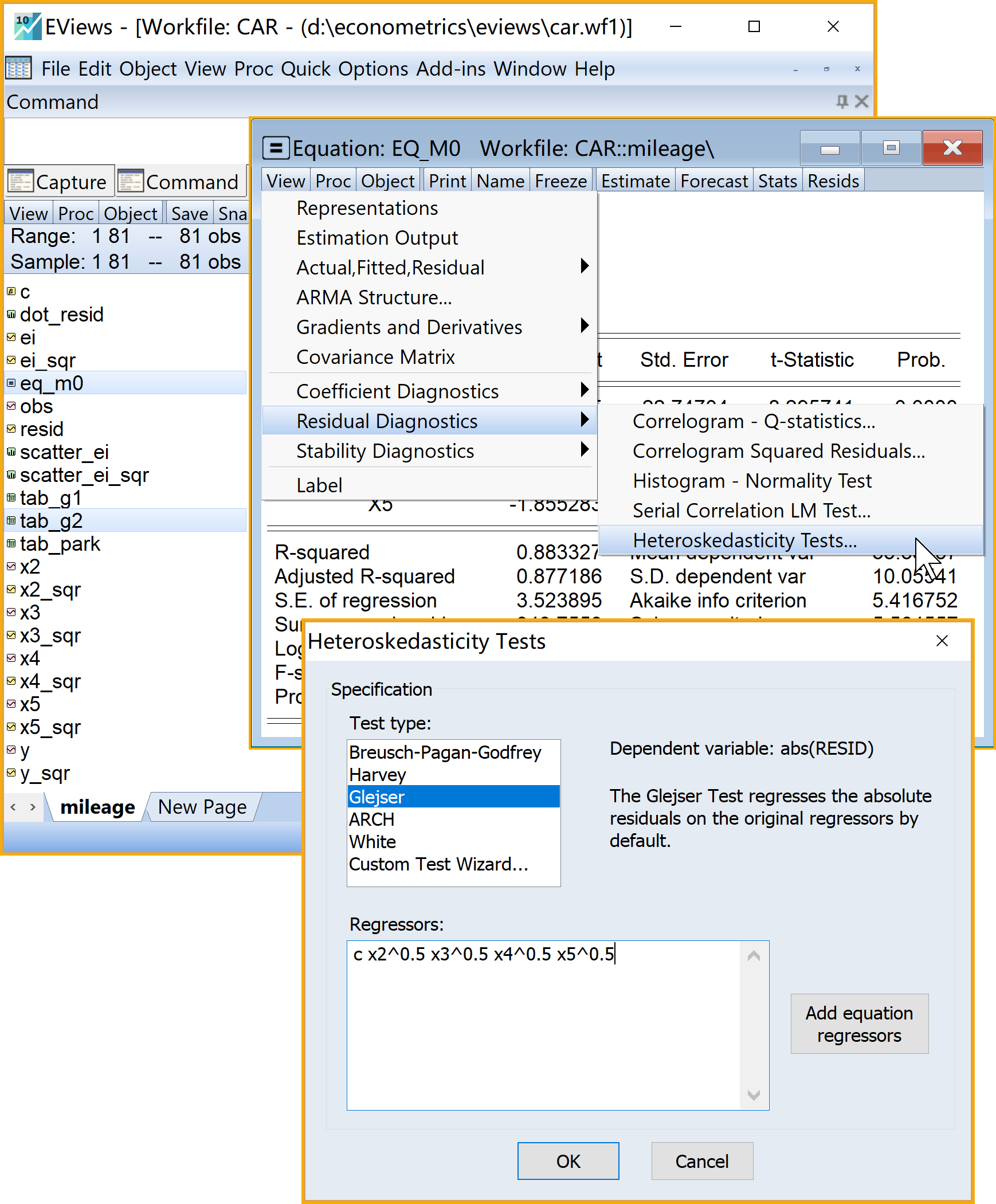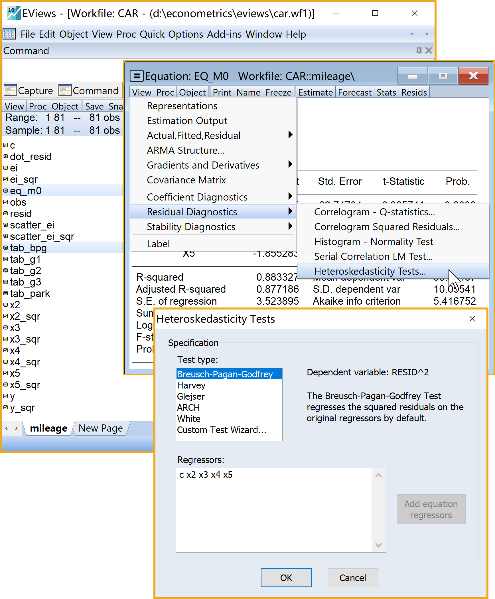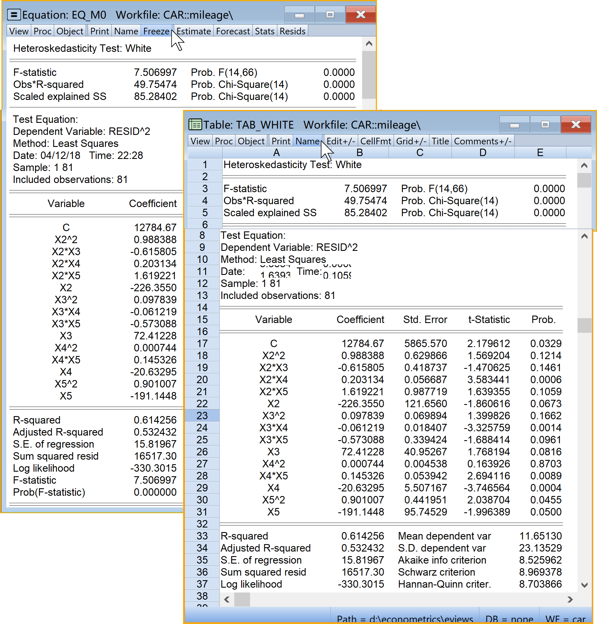 \[ \begin{aligned} e^2_i & =\hat{\alpha}_1+\hat{\alpha}_2X_{2i}+\hat{\alpha}_3X_{3i}+\hat{\alpha}_4X^2_{2i}+\hat{\alpha}_5X^2_{3i}+\hat{\alpha}_6X_{2i}X_{3i}+v_i \end{aligned} \tag{6.34}\]