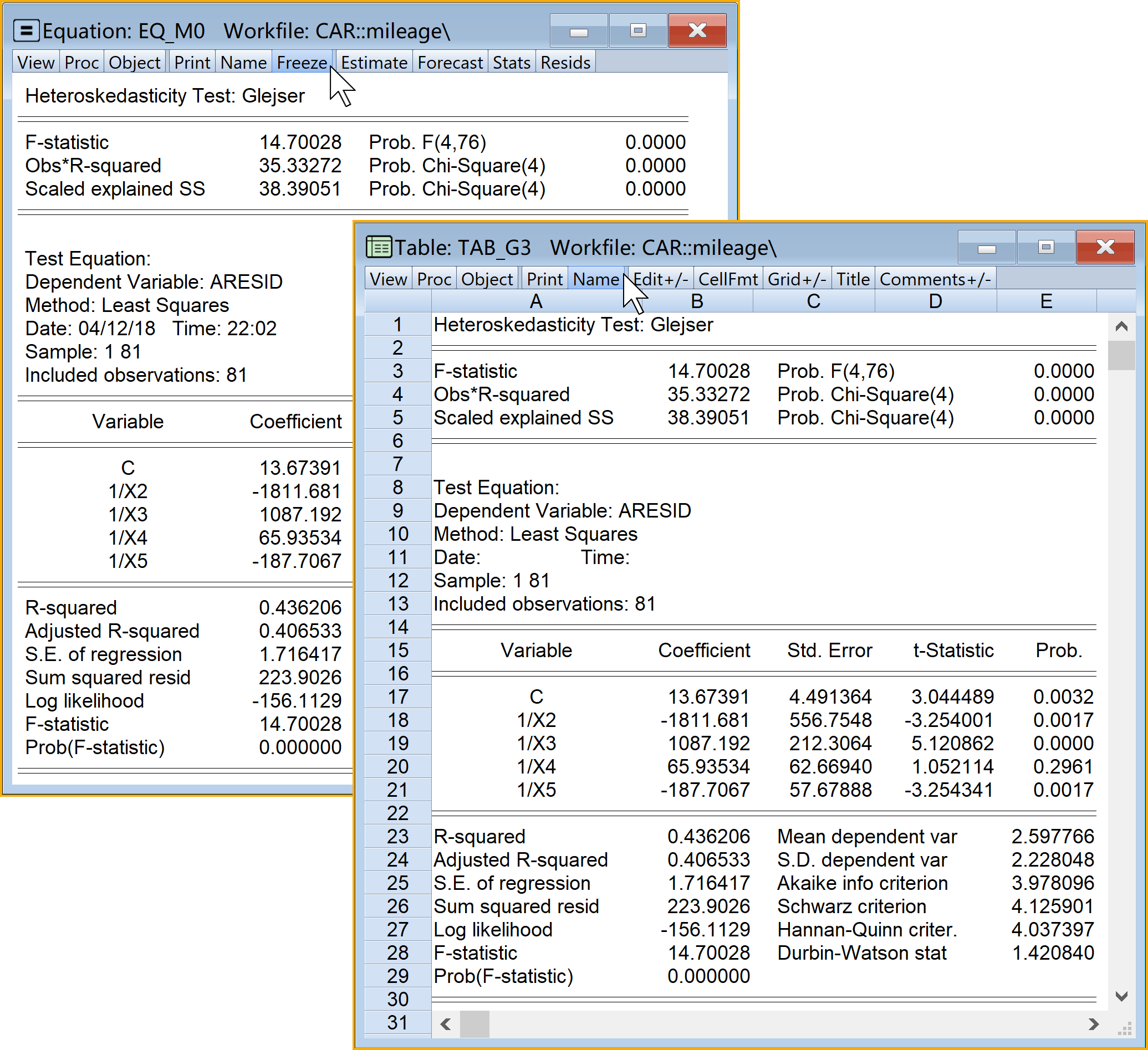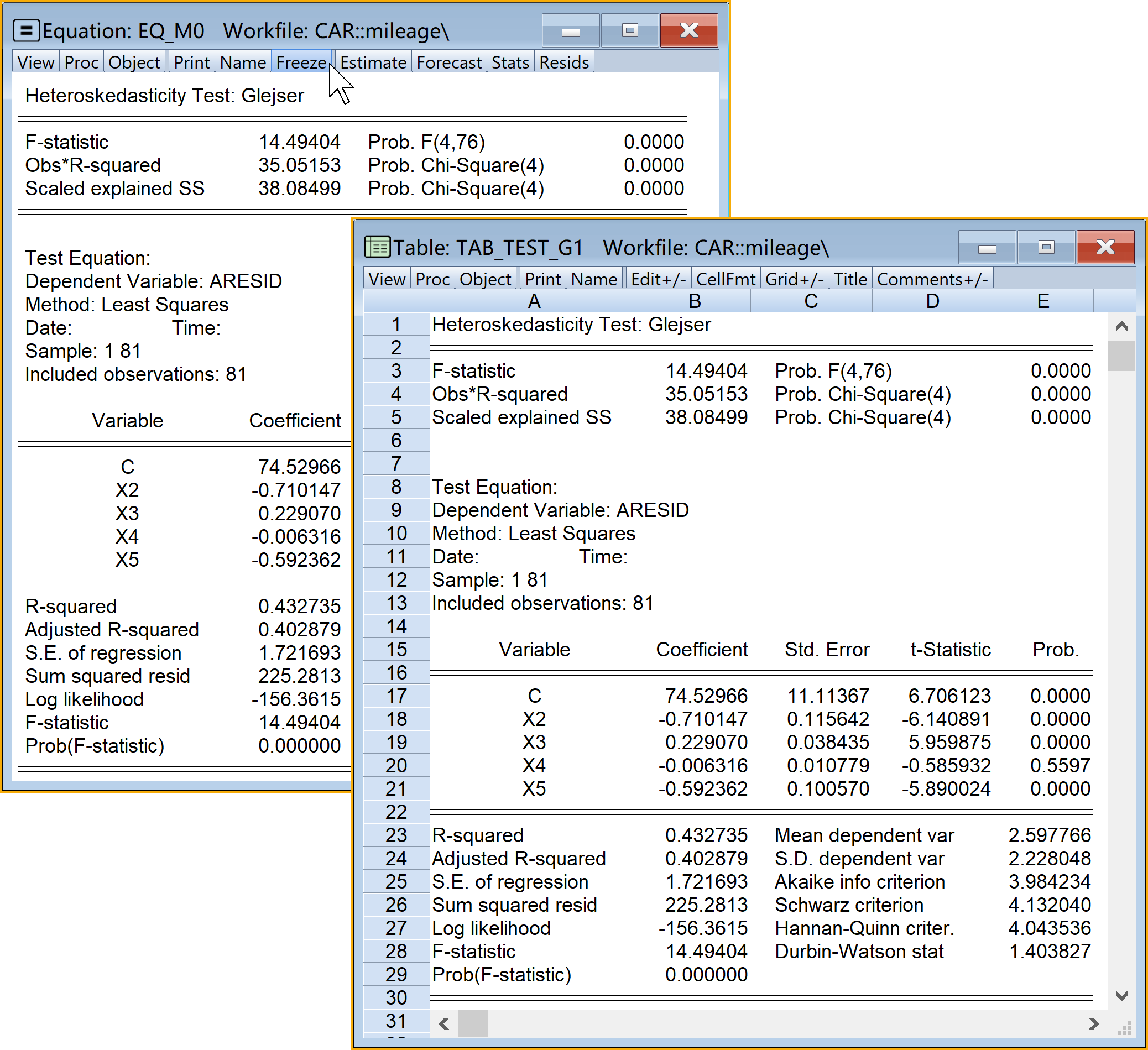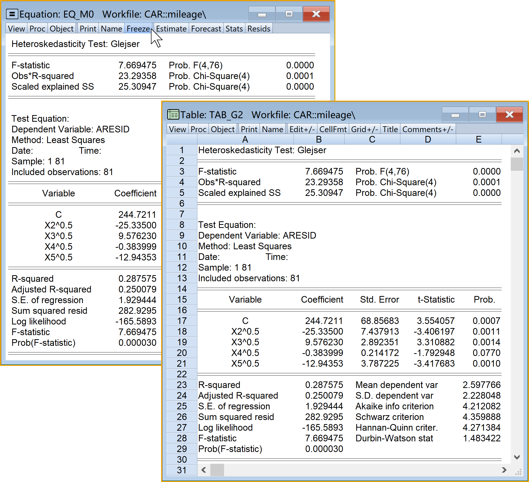(3)根据辅助回归方程结果得到异方差诊断结论