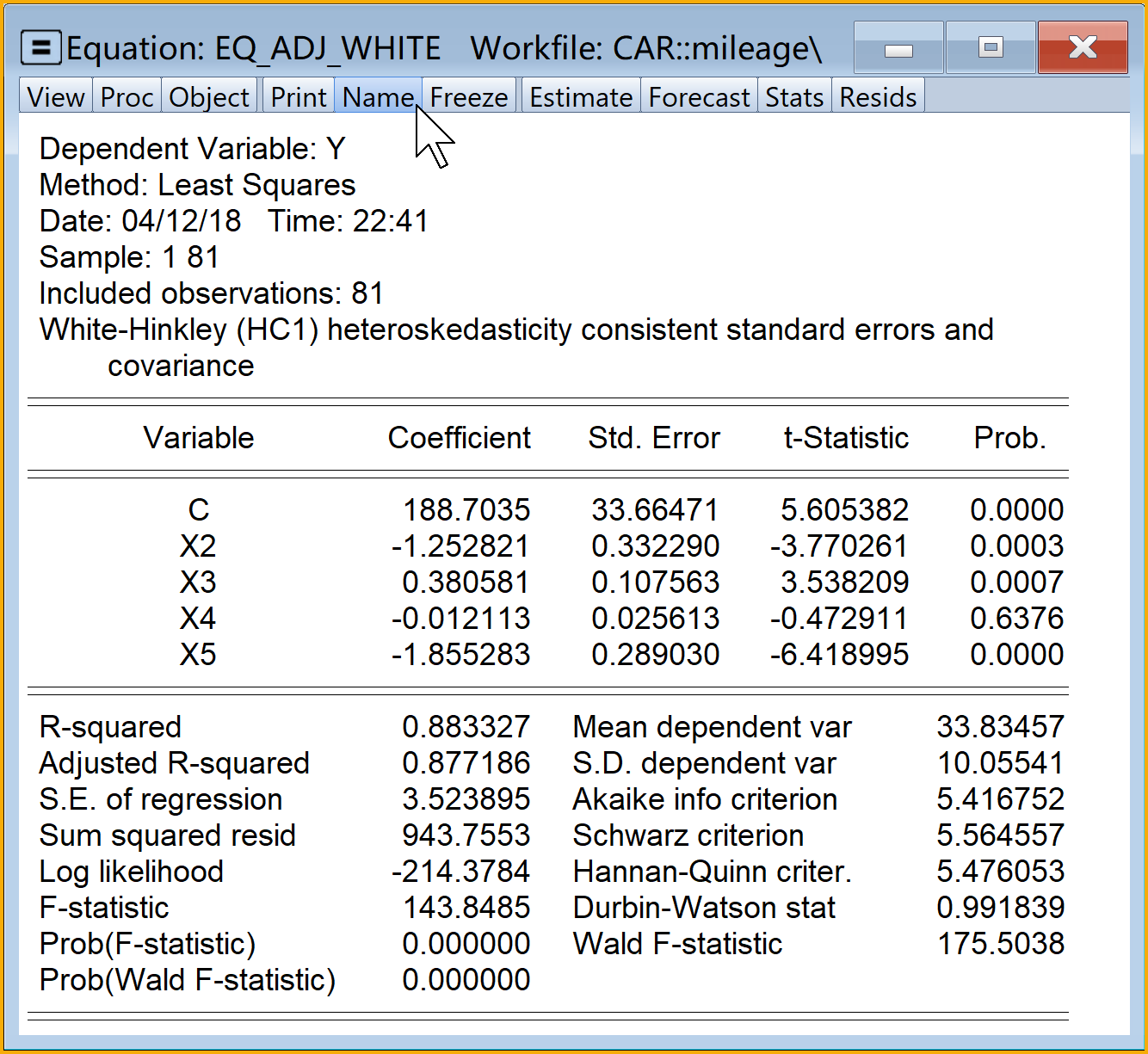 \[ \begin{aligned} \frac{Y_i}{\sqrt{X_i}} & =\frac{\hat{\beta}_1}{\sqrt{X_i}}+\hat{\beta}_2\sqrt{X_i}+\hat{\beta}_3\frac{X_{3i}}{\sqrt{X_i}}+\hat{\beta}_4\frac{X_{4i}}{\sqrt{X_i}}+\hat{\beta}_5\frac{X_{5i}}{\sqrt{X_i}}+\frac{e_{i}}{\sqrt{X_i}} \end{aligned} \tag{6.42}\]