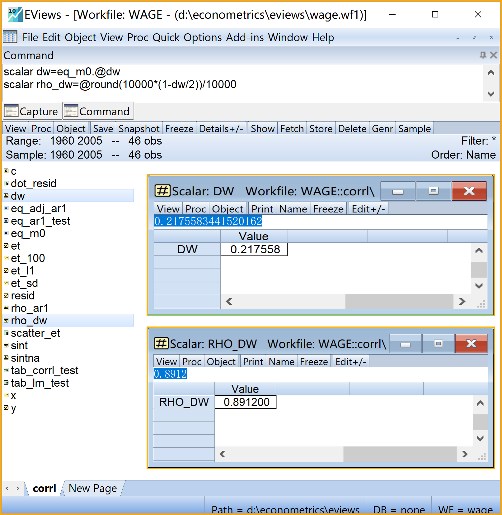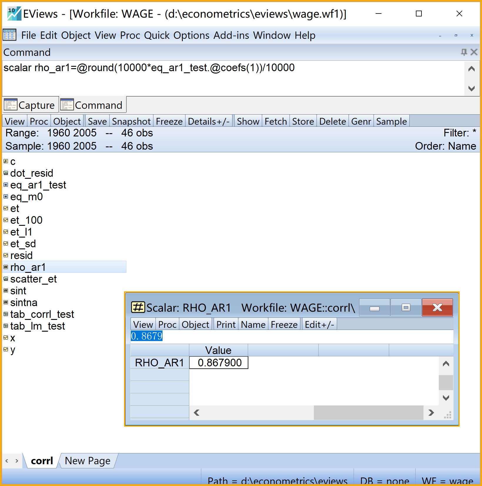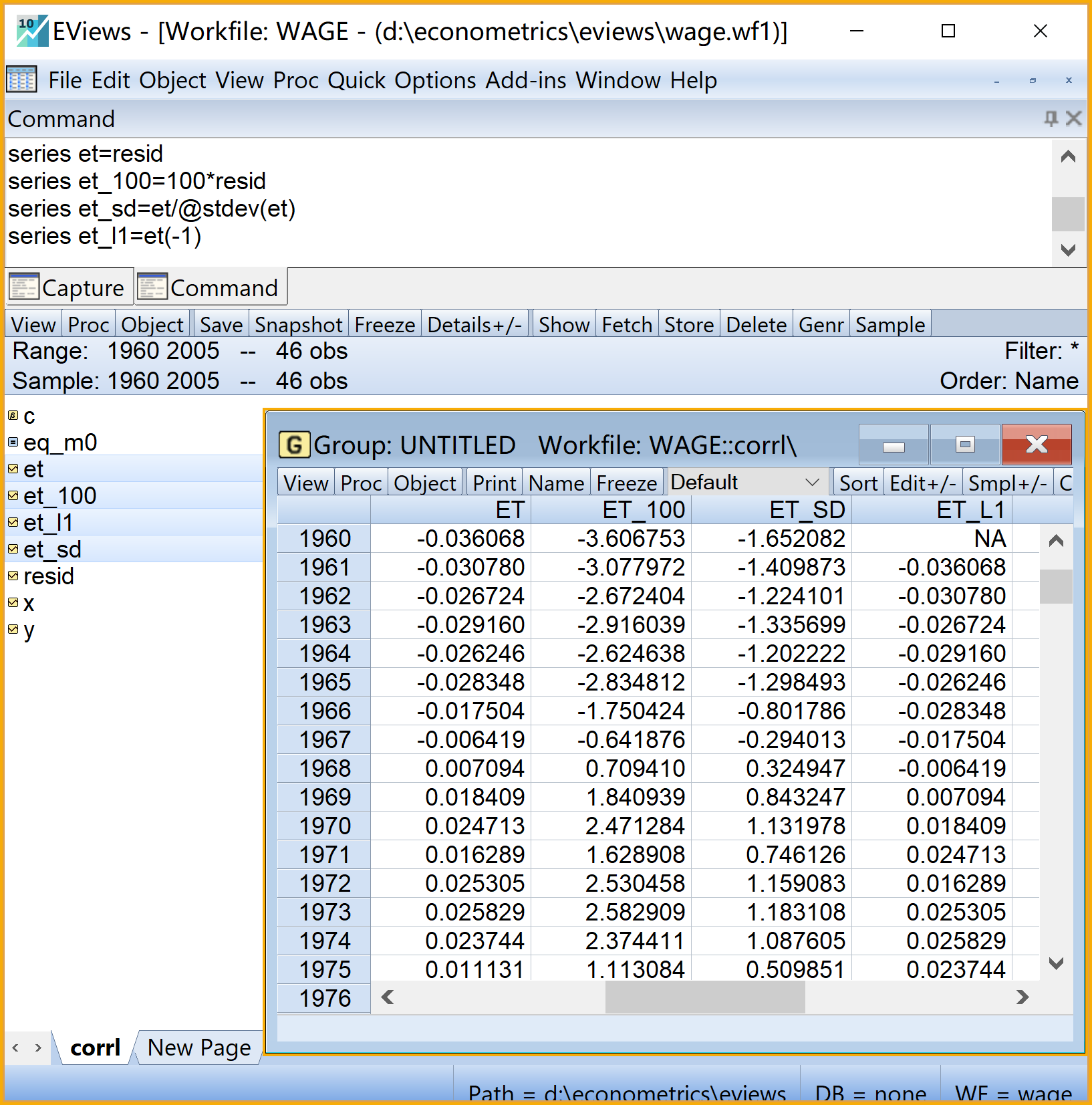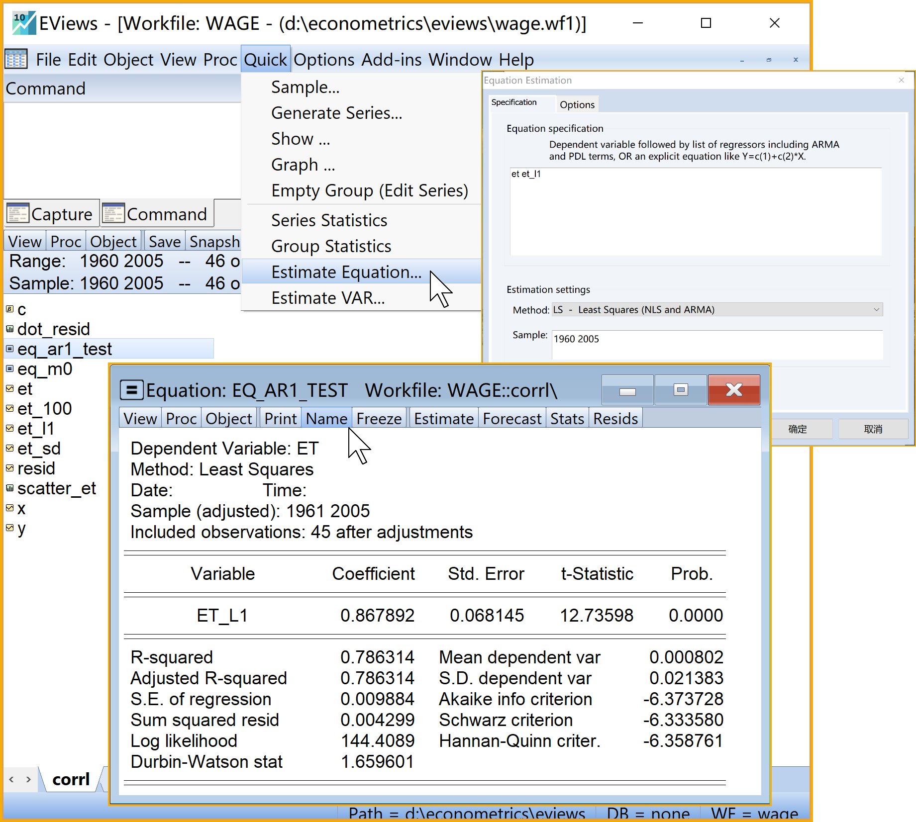 Eviews菜单操作(此处展示的是AR(1)的自相关情形,见 图 7.21):