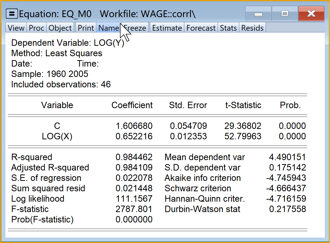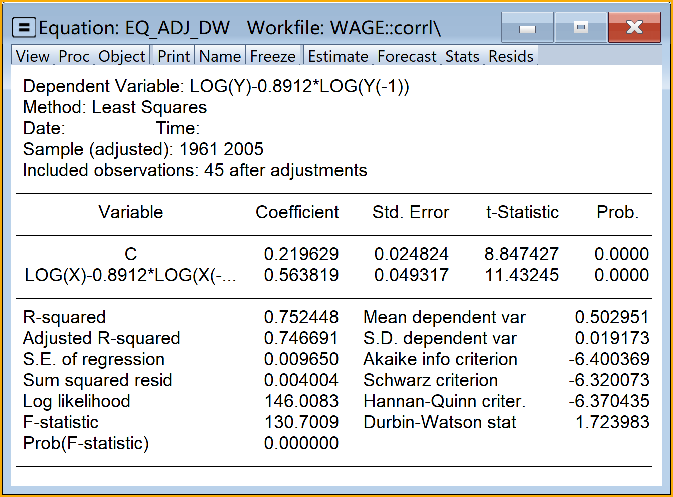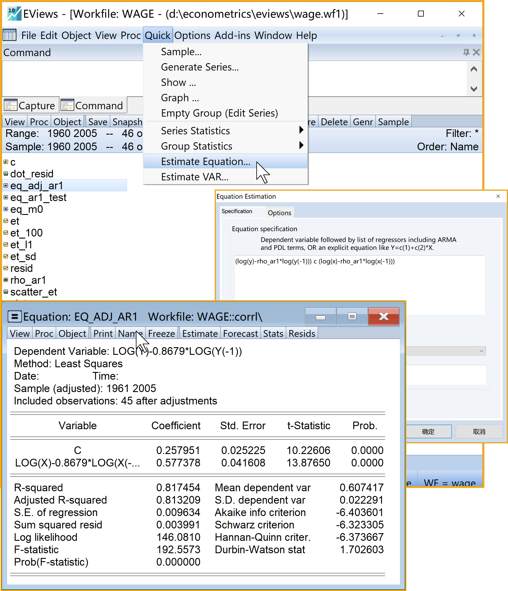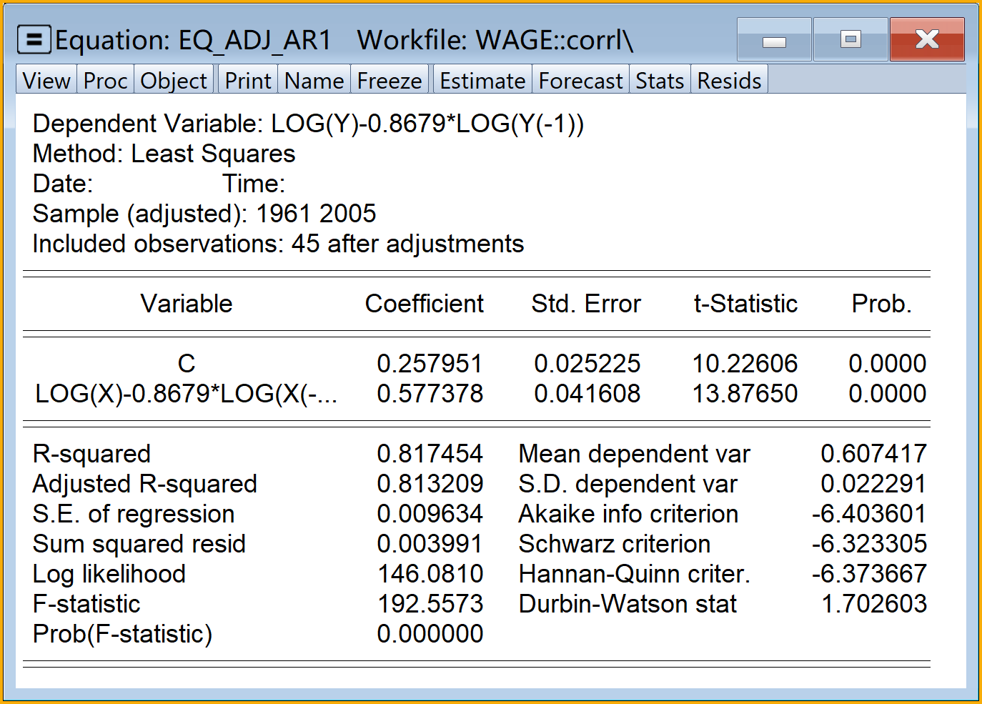 - Equation specification:输入命令log(Y) c log(X) AR(1)