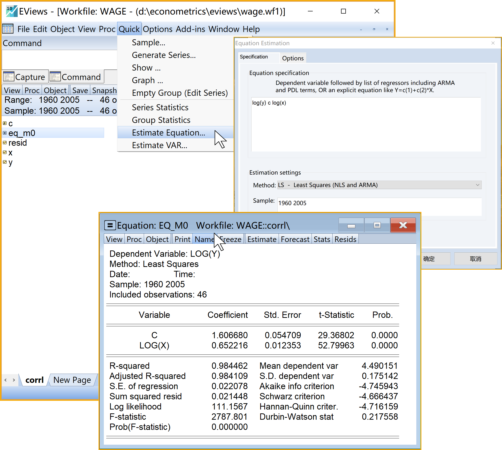 - 方程设置(Equation Specification): 输入变量log(Y) c log(X)