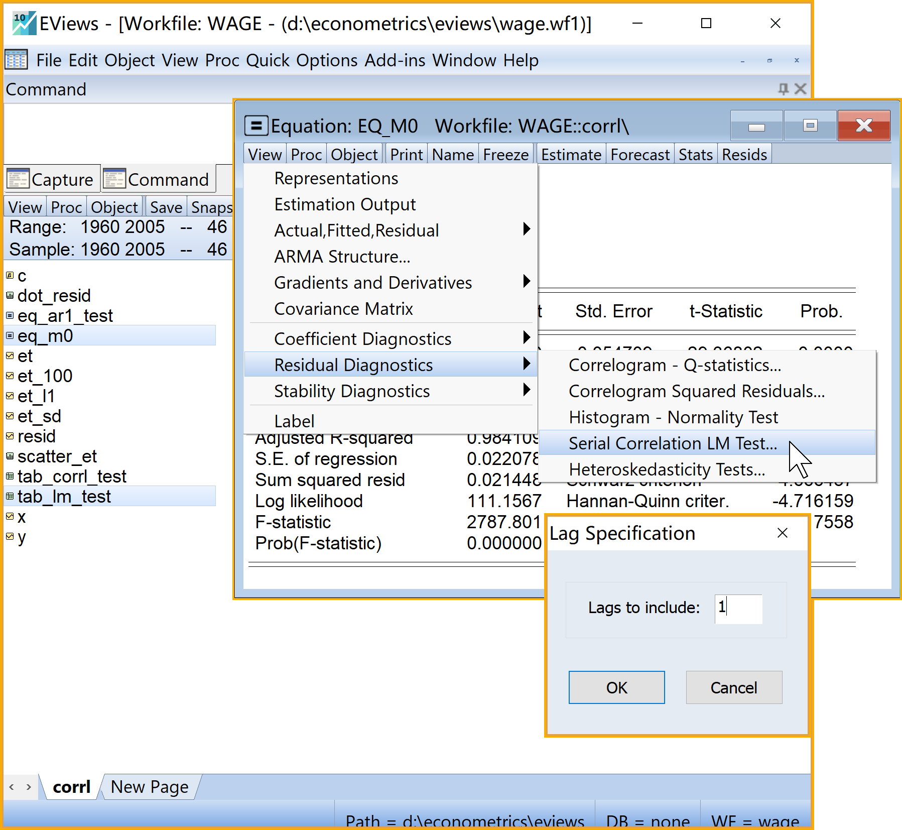 - 拉格朗日检验法(LM-test):Eviews菜单操作进行布罗施-戈弗雷(Breusch-Goldfrey)的拉格朗日检验(B-G LM test)