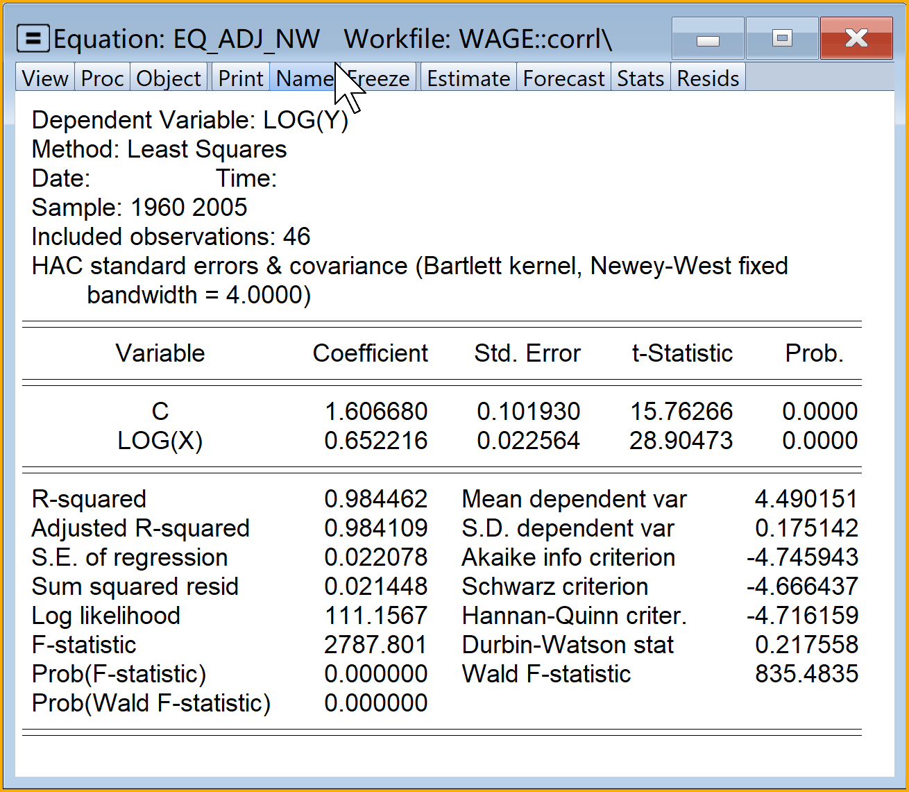 思路:利用Eviews菜单操作,进行基于尼威-威斯特(Newey-West)一致性标准误矫正程序的建模分析。