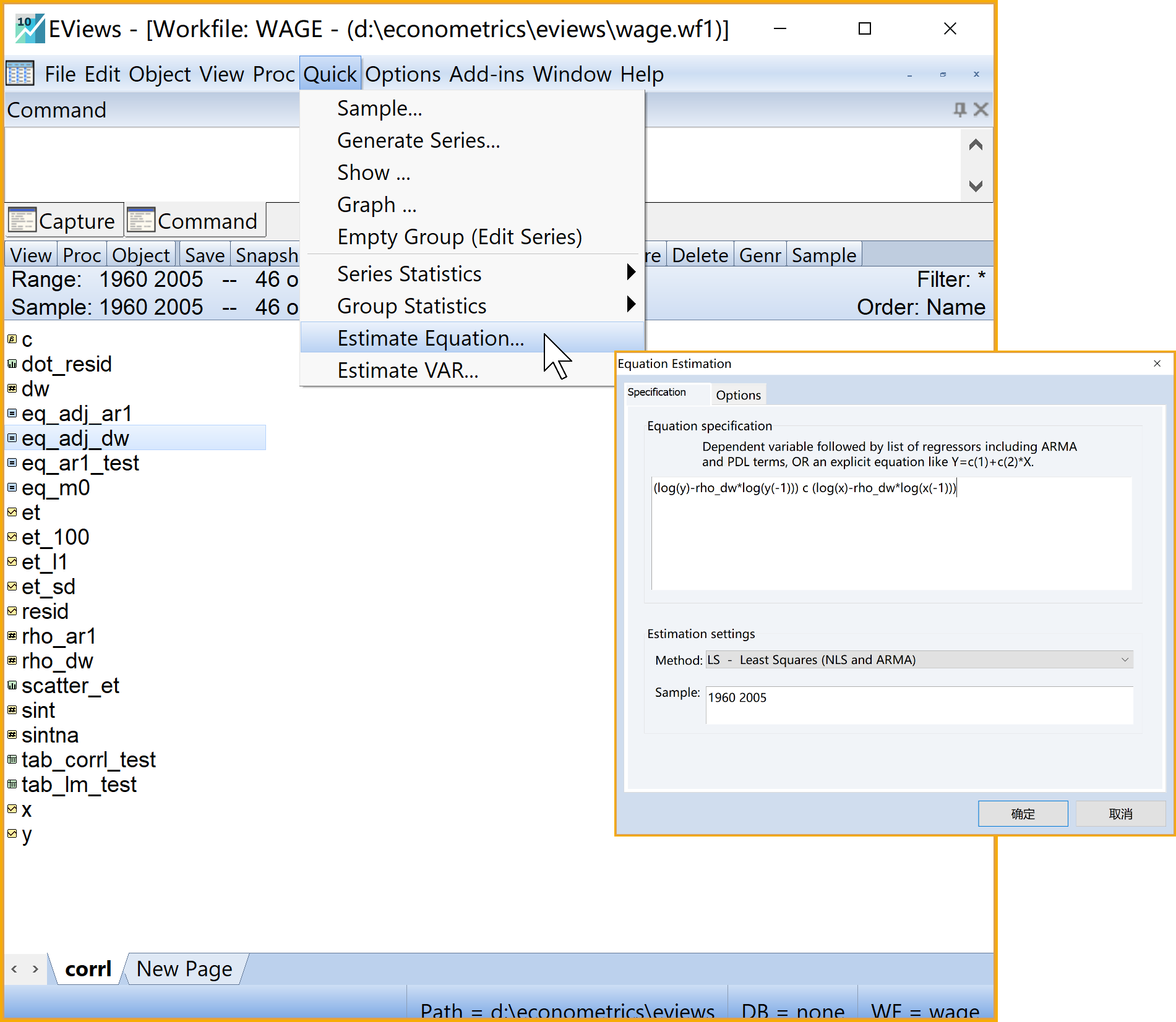 (log(y)-rho_dw*log(y(-1))) c (log(x)-rho_dw*log(x(-1)))Estimation settings:设置如下
