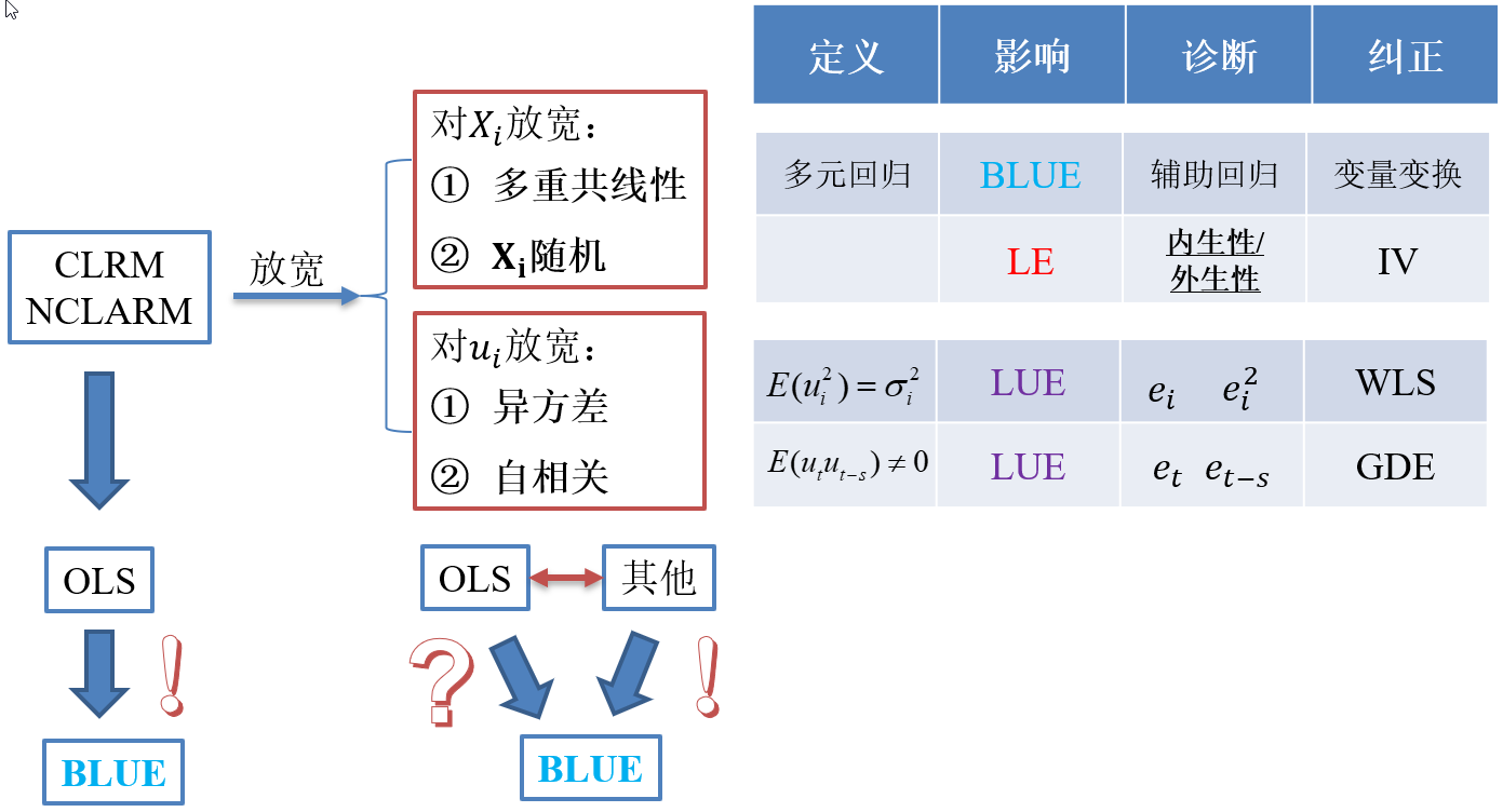 --- class: center, middle, duke-orange,hide_logo name: chapter-navi count: true # 模块1:计量经济学基础 .larger[ Chapter 01. 经典模型 Chapter 02. 矩阵分析 .red[[Chapter 03. 放宽假设](#chapter03)] Chapter 04. 扩展方法 ] --- class: center, middle, duke-softblue,hide_logo name: chapter03 # 第03章 放宽假设 [3.1 多重共线性(Multi-collinearity)问题](#multi) [.red[3.2 异方差(hetro-scadasticity)问题]](#hetero) [3.3 自相关(auto-correlation)问题](#auto) --- layout:false background-image: url("pic/chapter-03-frame-relax.png") background-size: cover class: inverse,center <!------> --- layout: false class: center, middle, duke-softblue,hide_logo name: hetero # 3.2 异方差(hetro-scadasticity)问题 [3.2.1 异方差性的定义和来源](#definition-hetero) [3.2.2 异方差性的影响和后果](#effect-hetero) [3.2.3 广义最小二乘法 (GLS)](#GLS-hetero) [3.2.4 异方差性问题的诊断](#diagnose-hetero) [3.2.5 异方差性问题的矫正](#adjust-hetero) [3.2.6 案例展示(异方差问题的诊断和矫正)](#example-hetero) --- layout: false class: center, middle, duke-softblue,hide_logo name: definition-hetero # 3.2.1 异方差性的定义和来源 --- layout: true <div class="my-header-h2"></div> <div class="watermark1"></div> <div class="watermark2"></div> <div class="watermark3"></div> <div class="my-footer"><span>huhuaping@ <a href="#chapter-navi">模块01 计量经济学基础 |</a>      <a href="#chapter03">第03章 放宽假设 |</a>      <a href="#hetero"> 3.2 异方差(hetro-scadasticity)问题 |</a>      <a href="#definition-hetero"> 3.2.1 异方差性的定义和来源 </a> </span></div> --- ## 异方差的概念与内涵 k变量总体回归模型(PRM) `$$\begin{align} Y_i&=\beta_1+\beta_2X_{2i}+\beta_3X_{3i}+\cdots+\beta_kX_{ki}+u_i && \text{(PRM)} \\ Y_i&=\hat{\beta}_1+\hat{\beta}_2X_{2i}+\hat{\beta}_3X_{3i}+\cdots+\hat{\beta}_kX_{ki}+e_i && \text{(SRM)} \\ \mathbf{y} &= \mathbf{X}\mathbf{\beta}+\mathbf{u} && \text{(PRM-matrix)} \\ \mathbf{y} &= \mathbf{X}\mathbf{\hat{\beta}}+\mathbf{e} && \text{(SRM-matrix)} \\ \end{align}$$` 则随机干扰项的方差协方差矩阵可以写成: `$$\begin{align} var-cov(\boldsymbol{u})&=E(\boldsymbol{uu'}) = \begin{bmatrix} \sigma_1^2 & \sigma_{12}^2 &\cdots &\sigma_{1n}^2\\ \sigma_{21}^2 & \sigma_2^2 &\cdots &\sigma_{2n}^2\\ \vdots & \vdots &\vdots &\vdots \\ \sigma_{n1}^2 & \sigma_{n2}^2 &\cdots &\sigma_n^2\\ \end{bmatrix} \end{align}$$` --- ## 异方差的概念与内涵 在**CLRM假设**下,随机干扰项为**同方差**(homoscedasticity),且随机干扰项之间**不相关**。也即: `$$\begin{align} E(u_i^2) &=\sigma^2;\quad (i \in 1,2,\cdots,n)\\ cov(u_iu_j) &=0;\quad (i \neq j) \end{align}$$` 则,随机干扰项的方差协方差矩阵进一步可以写成: `$$\begin{align} var-cov(\boldsymbol{u})=E(\boldsymbol{uu'}) \equiv \sigma^2 \begin{bmatrix} 1 & 0 &\cdots &0\\ 0 & 1 &\cdots &0\\ \vdots & \vdots &\vdots &\vdots \\ 0 & 0 &\cdots &1\\ \end{bmatrix} \equiv \sigma^2\boldsymbol{I} \end{align}$$` --- ## 异方差的概念与内涵 考虑违背了**CLRM假设**的一种情形:随机干扰项具有**异方差**(hetroscadasticity),但仍假设随机干扰项之间不相关。也即: `$$\begin{align} E(u_i^2) &=\sigma_i^2;\quad i ( \in 1,2,\cdots,n)\\ cov(u_iuj) & = 0;\quad (i \neq j) \end{align}$$` 随机干扰项的方差协方差矩阵可以表达为: `$$\begin{align} var-cov(\boldsymbol{u})&=E(\boldsymbol{uu'}) = \begin{bmatrix} \sigma_1^2 & 0 &\cdots & 0\\ 0 & \sigma_2^2 &\cdots 0\\ \vdots & \vdots &\vdots & \vdots \\ 0 & 0 &\cdots &\sigma_n^2\\ \end{bmatrix} \end{align}$$` --- ### 异方差的概念与内涵(图示1) <div class="figure" style="text-align: center"> <img src="pic/chpt3-CLRM-homoscedasticity.png" alt="随机干扰项的方差处处相等" width="608" /> <p class="caption">随机干扰项的方差处处相等</p> </div> --- ### 异方差的概念与内涵(图示2) <div class="figure" style="text-align: center"> <img src="pic/chpt3-CLRM-heteroscedasiticity.png" alt="随机干扰项的方差随X取值不同而不同" width="599" /> <p class="caption">随机干扰项的方差随X取值不同而不同</p> </div> --- ## 数值模拟比较1 <img src="pic/chpt8-heteroscedasiticity-demo1.png" width="846" style="display: block; margin: auto;" /> --- ## 数值模拟比较2 <img src="pic/chpt8-heteroscedasiticity-demo2.png" width="801" style="display: block; margin: auto;" /> --- ## 数值模拟比较3 <img src="pic/chpt8-heteroscedasiticity-demo3.png" width="801" style="display: block; margin: auto;" /> --- ## 异方差的来源 **异方差的来源1**:**边错边改**误差学习模型(error-learning models)的普遍存在。 - 人们的行为误差随时间而减少。 <div class="figure" style="text-align: center"> <img src="pic/chpt8-hetero-scedasiticity-source1.png" alt="打字出错与打字练习时长的关系" width="662" /> <p class="caption">打字出错与打字练习时长的关系</p> </div> --- ## 异方差的来源 **异方差的来源2**:随着收入的增长,人们在支出和储蓄中有更大的灵活性。 - 在做储蓄对收入的回归中,随机干扰项的方差 `\(\sigma^2\)`与收入俱增。 - 随着收入的增长,人们在支出和储蓄中有更大的灵活性。 **异方差的来源3**:随着数据采集技术的改进,随机干扰项的方差 `\(\sigma^2\)`可能会逐渐减小。 - 有成熟的数据处理设备的银行,在为客户提供的月度或季度报表中,相对于没有这种设备的银行,会出现更少的差错。 --- ## 异方差的来源 **异方差的来源4**:**异常值**(outliers)的出现可能导致异方差性增大。 - 异常观测是来自于与产生其余观测值的总体不同的另一个总体。 - 对于小样本数据,问题会更大。 <div class="figure" style="text-align: center"> <img src="pic/chpt8-hetero-scedasiticity-source4.png" alt="股票价格与消费价格的关系" width="39