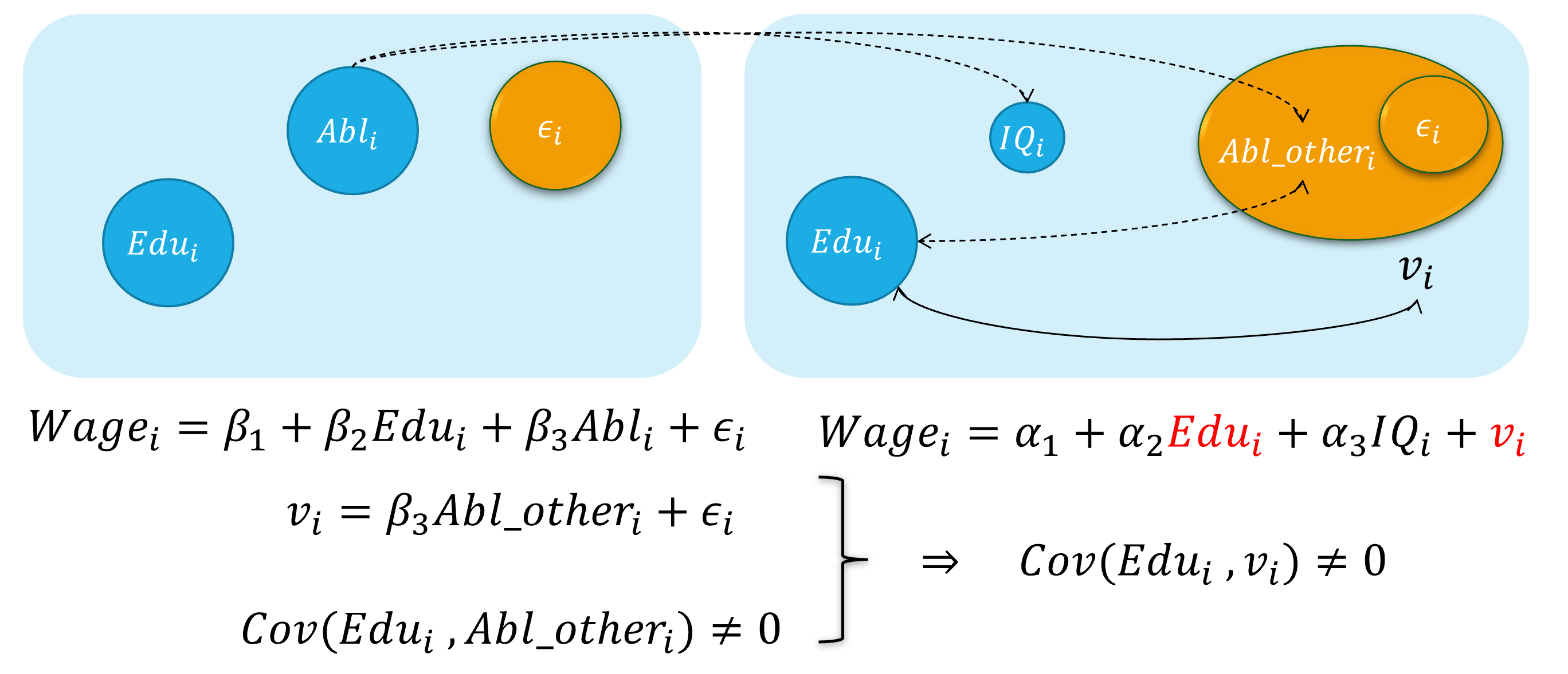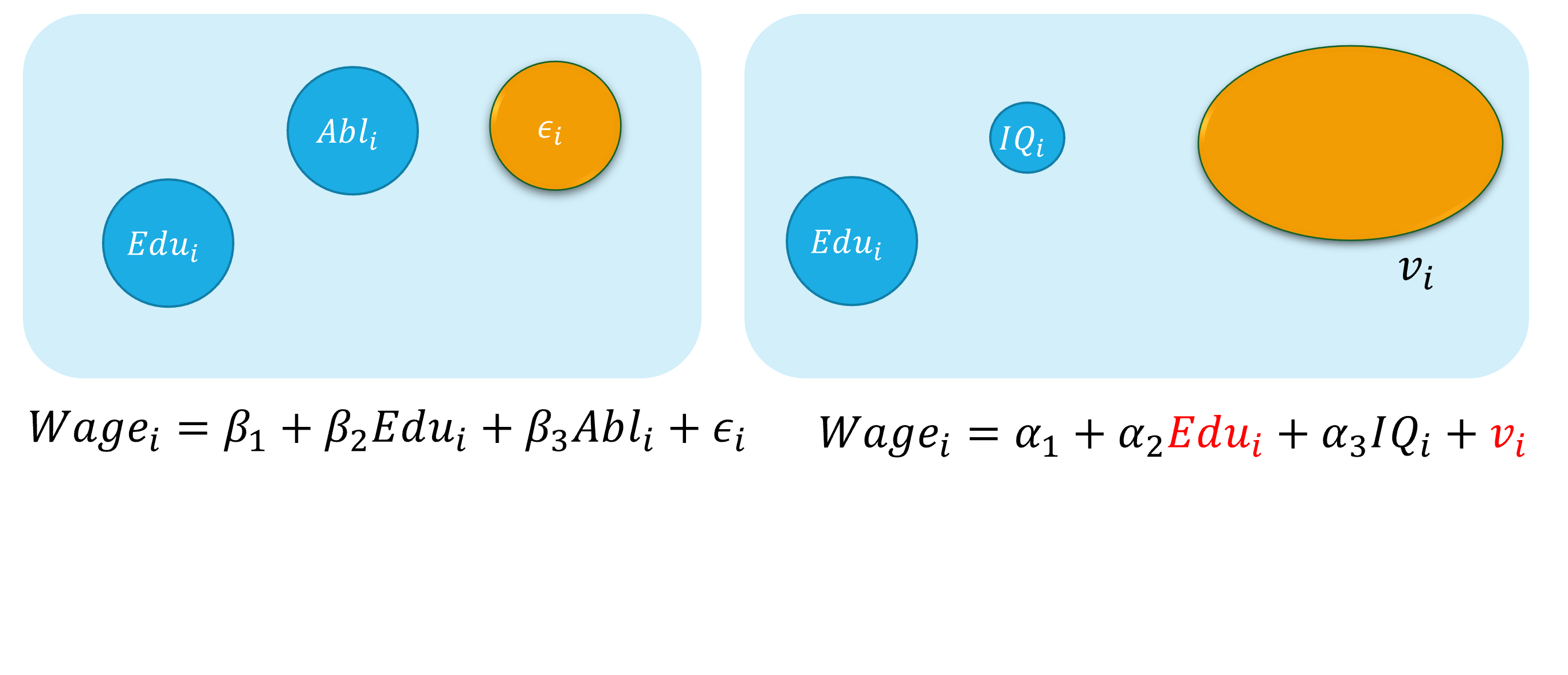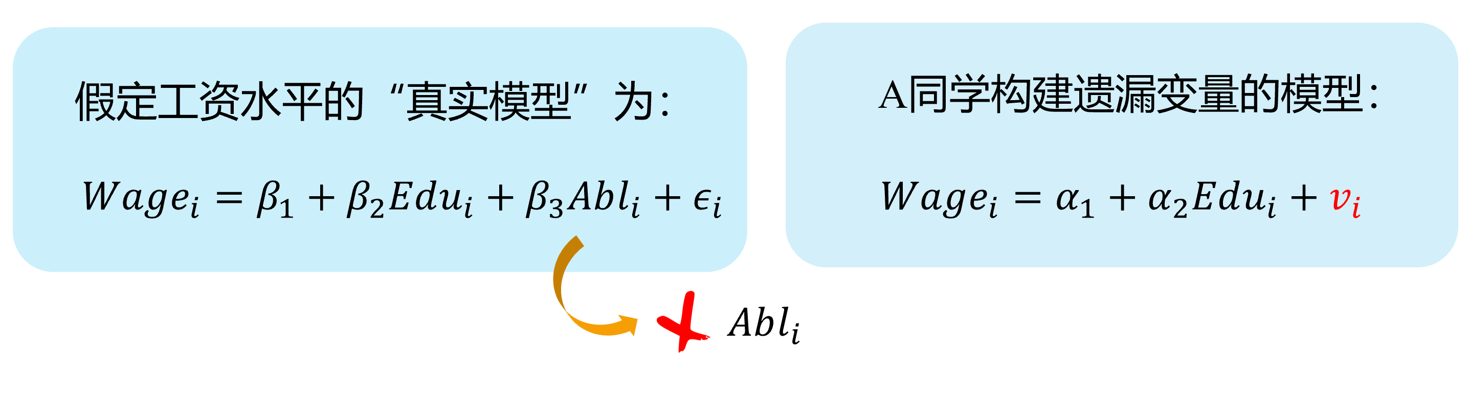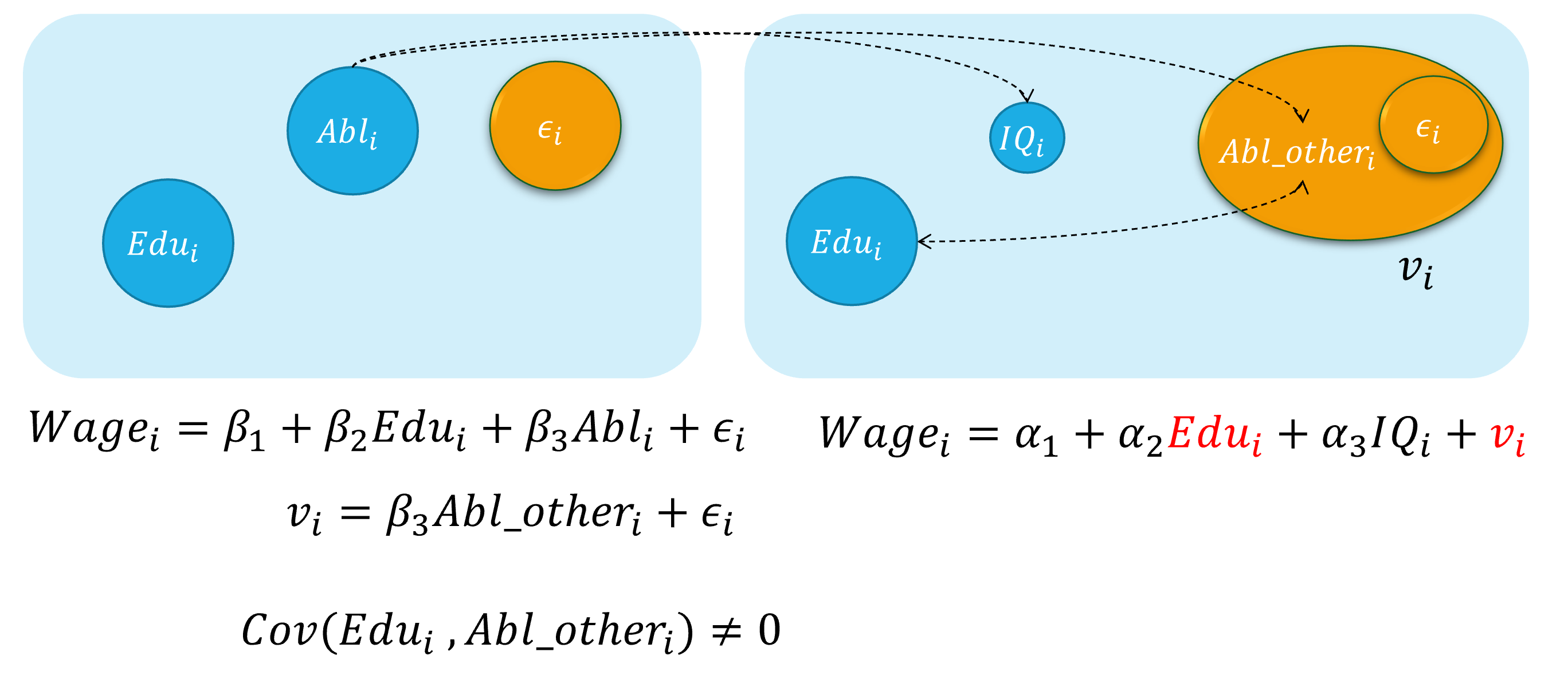 --- class: center, middle, duke-orange,hide_logo name: chapter-navi count: true # 模块04:联立方程模型(SEM) .large[ [.red[Chapter 17. 内生性问题与工具变量法]](#chapter17) [Chapter 18. 为什么要关心联立方程模型?](#chapter18) [Chapter 19. 联立方程模型的识别问题](#chapter19) [Chapter 20. 联立方程模型的估计方法](#chapter20) ] --- layout: false class: center, middle, duke-softblue,hide_logo name: chapter17 # 17. 内生性问题与工具变量法 [17.1 内生自变量问题的定义和来源](#source) [17.2 内生变量法下的估计问题](#problem) [17.3 工具变量及其选择](#IV) [17.4 两阶段最小二乘法(2SLS)](#TSLS) [17.5 检验工具变量的有效性(Instrument validity)](#validity) [17.6 检验自变量的内生性(regressor endogeneity)](#endogeneity-test) --- layout: false class: center, middle, duke-softblue,hide_logo name: source # 17.1 内生自变量问题的定义和来源 --- layout: true <div class="my-header-h2"></div> <div class="watermark1"></div> <div class="watermark2"></div> <div class="watermark3"></div> <div class="my-footer"><span>huhuaping@ <a href="#chapter-navi">模块04 联立方程模型(SEM) |</a>          <a href="#chapter17"> 17 内生性问题与工具变量法 |</a>          <a href="#source"> 17.1 内生自变量问题的定义和来源 </a> </span></div> --- ## 知识回顾 对于总体回归模型: `$$\begin{align} Y_i &= \beta_1 +\beta_2X_i + u_i && \text{(PRM)} \end{align}$$` - 在CLRM假设下:**CLRM假设A2**——X是固定的(给定的)或独立于误差项。也即自变量X**不是**随机变量。此时,我们可以使用OLS方法,并得到**BLUE**。 `$$\begin{align} Cov(X_i, u_i)= 0\\ E(X_i u_i)= 0 \end{align}$$` -- - 如果违背上述假设,也即自变量X与随机干扰项相关。此时使用OLS估计将不再能得到**BLUE**,而应该采用**工具变量法**(IV)进行估计。 `$$\begin{align} Cov(X_i, u_i) \neq 0\\ E(X_i u_i) \neq 0 \end{align}$$` -- 事实上,无论 `\(X_i\)`与 `\(u_i\)`是否相关,我们都可以采用**IV法**得到**BLUE**。 --- ## 好模型的标准与外生自变量 `$$\begin{equation} \boldsymbol{y= X \beta+u} \end{equation}$$` **随机控制实验**(randomized controlled experiment):理想情形下,自变量X的取值是随机分配变化的(**原因**),然后我们再来观测因变量Y的变化(**结果**)。 - 如果 `\(Y_i\)`和 `\(X_i\)`确实存在系统性的关系(线性关系),那么改变 `\(X_i\)`则导致 `\(Y_i\)`的相应变化。 - 除此之外的任何其他随机因素,都将放到随机干扰项 `\(u_i\)`中,它对因变量 `\(Y_i\)`的变动影响,应该是**独立于** `\(X_i\)`的影响作用的。 --- ## 好模型的标准与外生自变量 **外生自变量**(exogenous regressors):如果自变量 `\(X_i\)`真的是如上所说的**完美的随机取值**(randomly assigned),则称之为外生自变量。更准确地,可以定义为: > **严格外生性假设**(strictly exogeneity): `\(E\left(u_{i} \mid X_{1}, \ldots, X_{N}\right)=E\left(u_{i} \mid \mathbf{x}\right)=0\)`。 因为在**随机控制实验**,给定样本 `\(i\)`和样本 `\(j\)`,自变量的取值分别为 `\(X_i\)`和 `\(X_j\)`,它们应该是相互独立的。因此可以把上述假设进一步简化为: > **同期外生性假设**(contemporaneously exogeneity): `\(E(u_i|X_{i})=0, \text{for } i =1, \ldots,N\)`。 ??? **同期**表示的是在同样的时间点上,或所有的截面观测单位在某个时间上获得的观测。 --- ## 大样本情况下OLS方法 在大样本情形下,上述**严格外生性假设**可以进一步转换为**同期不相关假设**: - `\(E(u_i)=0\)`,而且 - `\(\operatorname{cov}(X_i, u_i)=0\)` 因为我们可以证明(证明略),在大样本情况OLS方法下: - `\(E(u_i|X_{i})=0 \quad \Rightarrow \quad E(u_i)=0\)` - `\(E(u_i|X_{i})=0 \quad \Rightarrow \quad \operatorname{cov}(X_i, u_i)=0\)` --- ## 内生自变量问题的定义 `$$\begin{equation} \boldsymbol{y= X \beta+u} \end{equation}$$` 在经典线性回归模型假设(**CLRM**)中,我们假设所有回归元 `\(X_{i}\)`是**给定的**,且随机干扰项的条件期望为0( `\(E(u_i|X_{i})=0\)`)。 - 回归元是**严格外生性**具有重要意义,因为理论上将表明模型的预测误差将是最小的(等于0) - 实际上,我们的这一假设要求非常高,在**随机控制实验**中要求 `\(X_{ki}\)`是**同期外生性**的 `\(E(u_i|X_{i})=0, \text{for } i =1, \ldots,N\)`。 然而,现实中,回归元 `\(X_{i}\)`可能是**随机的**;而且回归元与随机干扰项可以能是**相关的**。此时,我们称模型存在**内生自变量**(endogenous regressors)问题。正式地: - 如果自变量与随机干扰项无关,则称之为**外生变量**(**.red[ex]ogenous**) - 如果自变量与随机干扰项相关,则称之为**内生变量**(**.red[en]dogenous**)。 --- ## 内生自变量问题的几种情形 在应用计量经济学中,内生性通常以以下四种方式之一出现: - **遗漏变量**(Omitted variables) - **测量误差**(Measurement errors) - **自相关问题**(Autocorrelation) - **方程联立性问题**(Simultaneity) --- ### 内生自变量情形1:遗漏变量 假定假定工资水平的“真实模型”为: `$$\begin{align} Wage_{i}=\beta_{1}+\beta_{2} Edu_{i}+\beta_{3} Abl_{i}+\epsilon_{i} \quad \text{(the assumed true model)} \end{align}$$` 然而,因为个体的**能力变量** `\(Abl\)` 往往无法直接观测得到,因此我们往往不能放入到模型中,并构建了一个有偏误的模型。 `$$\begin{align} Wage_{i}=\alpha_{1}+\alpha_{2} Edu_{i}+v_{i} \quad \text{(the error specified model)} \end{align}$$` > 其中**能力变量** `\(Abl\)` 被包含到新的随机干扰项 `\(v_i\)`中,也即: `\(v_{i}=\beta_{3} abl_{i}+u_{i}\)` 显然,我们认为偏误模型中,忽略了**能力变量** `\(Abl\)`,而**受教育年数变量** `\(Edu\)`实际上又与之有相关关系。进而偏误