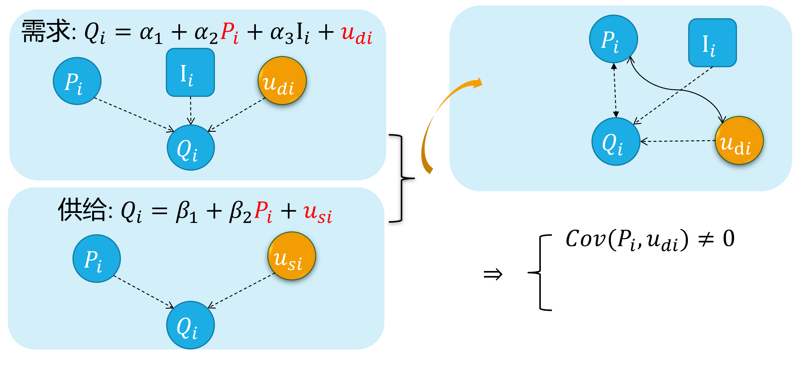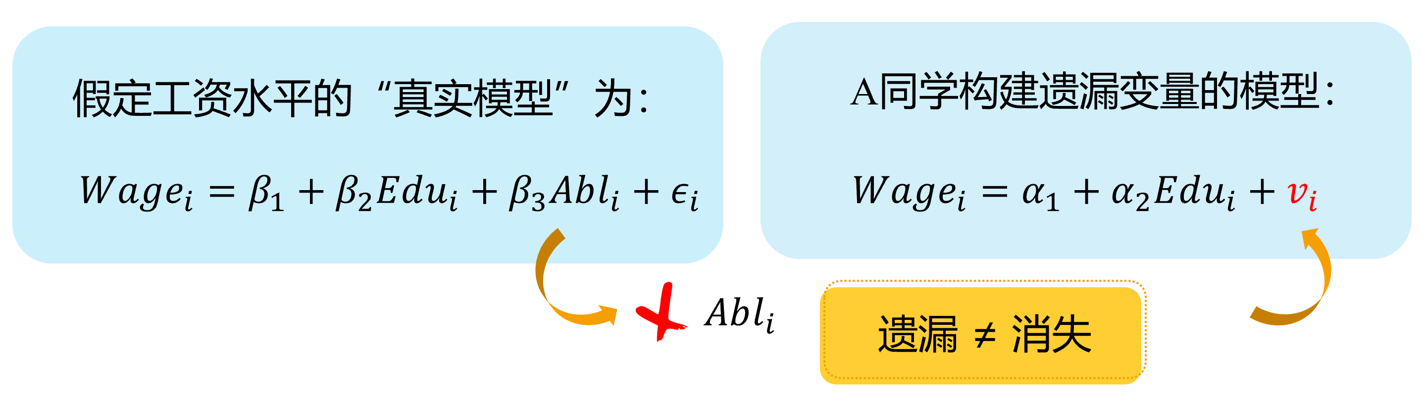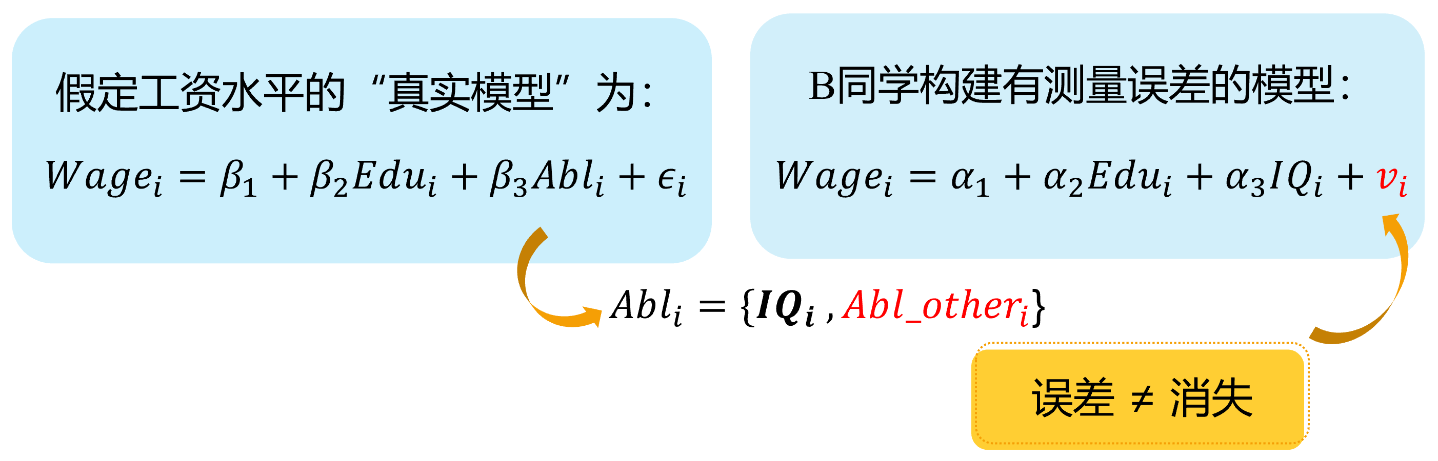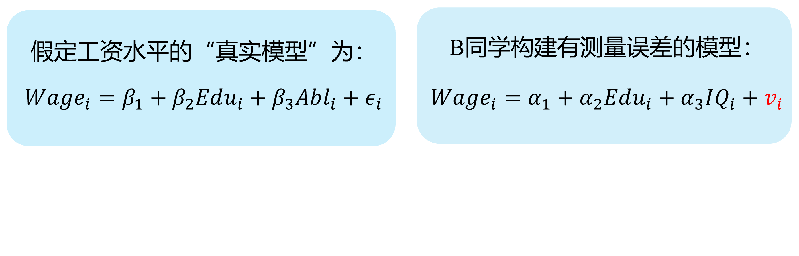 --- class: center, middle, duke-orange,hide_logo name: chapter-navi count: true # 模块04:联立方程模型(SEM) .large[ [.red[Chapter 17. 内生性问题与工具变量法]](#chapter17) [Chapter 18. 为什么要关心联立方程模型?](#chapter18) [Chapter 19. 联立方程模型的识别问题](#chapter19) [Chapter 20. 联立方程模型的估计方法](#chapter20) ] --- layout: false class: center, middle, duke-softblue,hide_logo name: chapter17 # 17. 内生性问题与工具变量法 [17.1 内生自变量问题的定义和来源](#source) [17.2 内生变量法下的估计问题](#problem) [17.3 工具变量及其选择](#IV) [17.4 两阶段最小二乘法(2SLS)](#TSLS) [17.5 检验工具变量的有效性(Instrument validity)](#validity) [17.6 检验自变量的内生性(regressor endogeneity)](#endogeneity-test) --- layout: false class: center, middle, duke-softblue,hide_logo name: source # 17.1 内生自变量问题的定义和来源 --- layout: true <div class="my-header-h2"></div> <div class="watermark1"></div> <div class="watermark2"></div> <div class="watermark3"></div> <div class="my-footer"><span>huhuaping@ <a href="#chapter-navi">模块04 联立方程模型(SEM) |</a>          <a href="#chapter17"> 17 内生性问题与工具变量法 |</a>          <a href="#source"> 17.1 内生自变量问题的定义和来源 </a> </span></div> --- ## 知识回顾 对于总体回归模型: `$$\begin{align} Y_i &= \beta_1 +\beta_2X_i + u_i && \text{(PRM)} \end{align}$$` - 在CLRM假设下:**CLRM假设A2**——X是固定的(给定的)或独立于误差项。也即自变量X**不是**随机变量。此时,我们可以使用OLS方法,并得到**BLUE**。 `$$\begin{align} Cov(X_i, u_i)= 0\\ E(X_i u_i)= 0 \end{align}$$` -- - 如果违背上述假设,也即自变量X与随机干扰项相关。此时使用OLS估计将不再能得到**BLUE**,而应该采用**工具变量法**(IV)进行估计。 `$$\begin{align} Cov(X_i, u_i) \neq 0\\ E(X_i u_i) \neq 0 \end{align}$$` -- 事实上,无论 `\(X_i\)`与 `\(u_i\)`是否相关,我们都可以采用**IV法**得到**BLUE**。 --- ## 好模型的标准与外生自变量 `$$\begin{equation} \boldsymbol{y= X \beta+u} \end{equation}$$` **随机控制实验**(randomized controlled experiment):理想情形下,自变量X的取值是随机分配变化的(**原因**),然后我们再来观测因变量Y的变化(**结果**)。 - 如果 `\(Y_i\)`和 `\(X_i\)`确实存在系统性的关系(线性关系),那么改变 `\(X_i\)`则导致 `\(Y_i\)`的相应变化。 - 除此之外的任何其他随机因素,都将放到随机干扰项 `\(u_i\)`中,它对因变量 `\(Y_i\)`的变动影响,应该是**独立于** `\(X_i\)`的影响作用的。 --- ## 好模型的标准与外生自变量 **外生自变量**(exogenous regressors):如果自变量 `\(X_i\)`真的是如上所说的**完美的随机取值**(randomly assigned),则称之为外生自变量。更准确地,可以定义为: > **严格外生性假设**(strictly exogeneity): `\(E\left(u_{i} \mid X_{1}, \ldots, X_{N}\right)=E\left(u_{i} \mid \mathbf{x}\right)=0\)`。 因为在**随机控制实验**,给定样本 `\(i\)`和样本 `\(j\)`,自变量的取值分别为 `\(X_i\)`和 `\(X_j\)`,它们应该是相互独立的。因此可以把上述假设进一步简化为: > **同期外生性假设**(contemporaneously exogeneity): `\(E(u_i|X_{i})=0, \text{for } i =1, \ldots,N\)`。 ??? **同期**表示的是在同样的时间点上,或所有的截面观测单位在某个时间上获得的观测。 --- ## 大样本情况下OLS方法 在大样本情形下,上述**严格外生性假设**可以进一步转换为**同期不相关假设**: - `\(E(u_i)=0\)`,而且 - `\(\operatorname{cov}(X_i, u_i)=0\)` 因为我们可以证明(证明略),在大样本情况OLS方法下: - `\(E(u_i|X_{i})=0 \quad \Rightarrow \quad E(u_i)=0\)` - `\(E(u_i|X_{i})=0 \quad \Rightarrow \quad \operatorname{cov}(X_i, u_i)=0\)` --- ## 内生自变量问题的定义 `$$\begin{equation} \boldsymbol{y= X \beta+u} \end{equation}$$` 在经典线性回归模型假设(**CLRM**)中,我们假设所有回归元 `\(X_{i}\)`是**给定的**,且随机干扰项的条件期望为0( `\(E(u_i|X_{i})=0\)`)。 - 回归元是**严格外生性**具有重要意义,因为理论上将表明模型的预测误差将是最小的(等于0) - 实际上,我们的这一假设要求非常高,在**随机控制实验**中要求 `\(X_{ki}\)`是**同期外生性**的 `\(E(u_i|X_{i})=0, \text{for } i =1, \ldots,N\)`。 然而,现实中,回归元 `\(X_{i}\)`可能是**随机的**;而且回归元与随机干扰项可以能是**相关的**。此时,我们称模型存在**内生自变量**(endogenous regressors)问题。正式地: - 如果自变量与随机干扰项无关,则称之为**外生变量**(**.red[ex]ogenous**) - 如果自变量与随机干扰项相关,则称之为**内生变量**(**.red[en]dogenous**)。 --- ## 内生自变量问题的几种情形 在应用计量经济学中,内生性通常以以下四种方式之一出现: - **遗漏变量**(Omitted variables) - **测量误差**(Measurement errors) - **自相关问题**(Autocorrelation) - **方程联立性问题**(Simultaneity) --- ### 内生自变量情形1:遗漏变量 假定假定工资水平的“真实模型”为: `$$\begin{align} Wage_{i}=\beta_{1}+\beta_{2} Edu_{i}+\beta_{3} Abl_{i}+\epsilon_{i} \quad \text{(the assumed true model)} \end{align}$$` 然而,因为个体的**能力变量** `\(Abl\)` 往往无法直接观测得到,因此我们往往不能放入到模型中,并构建了一个有偏误的模型。 `$$\begin{align} Wage_{i}=\alpha_{1}+\alpha_{2} Edu_{i}+v_{i} \quad \text{(the error specified model)} \end{align}$$` > 其中**能力变量** `\(Abl\)` 被包含到新的随机干扰项 `\(v_i\)`中,也即: `\(v_{i}=\beta_{3} abl_{i}+u_{i}\)` 显然,我们认为偏误模型中,忽略了**能力变量** `\(Abl\)`,而**受教育年数变量** `\(Edu\)`实际上又与之有相关关系。进而偏误