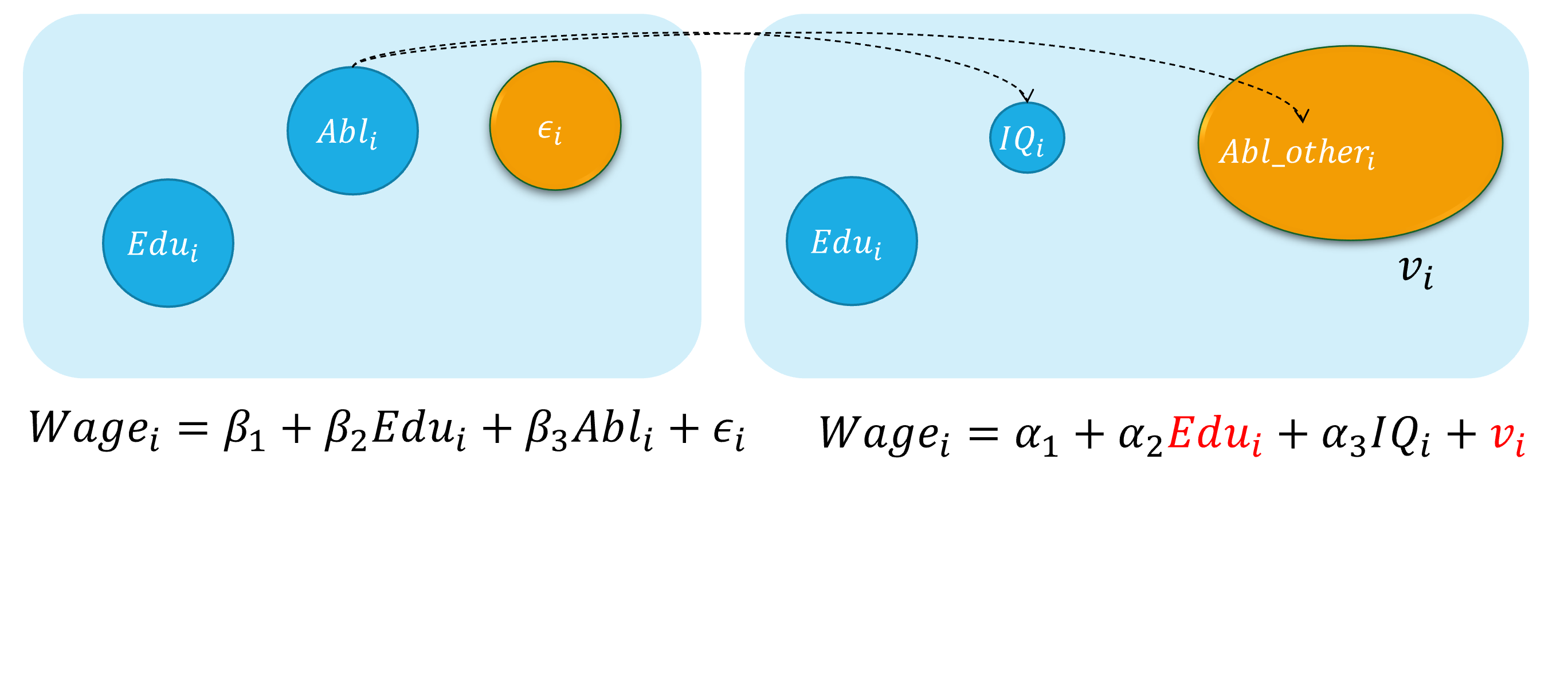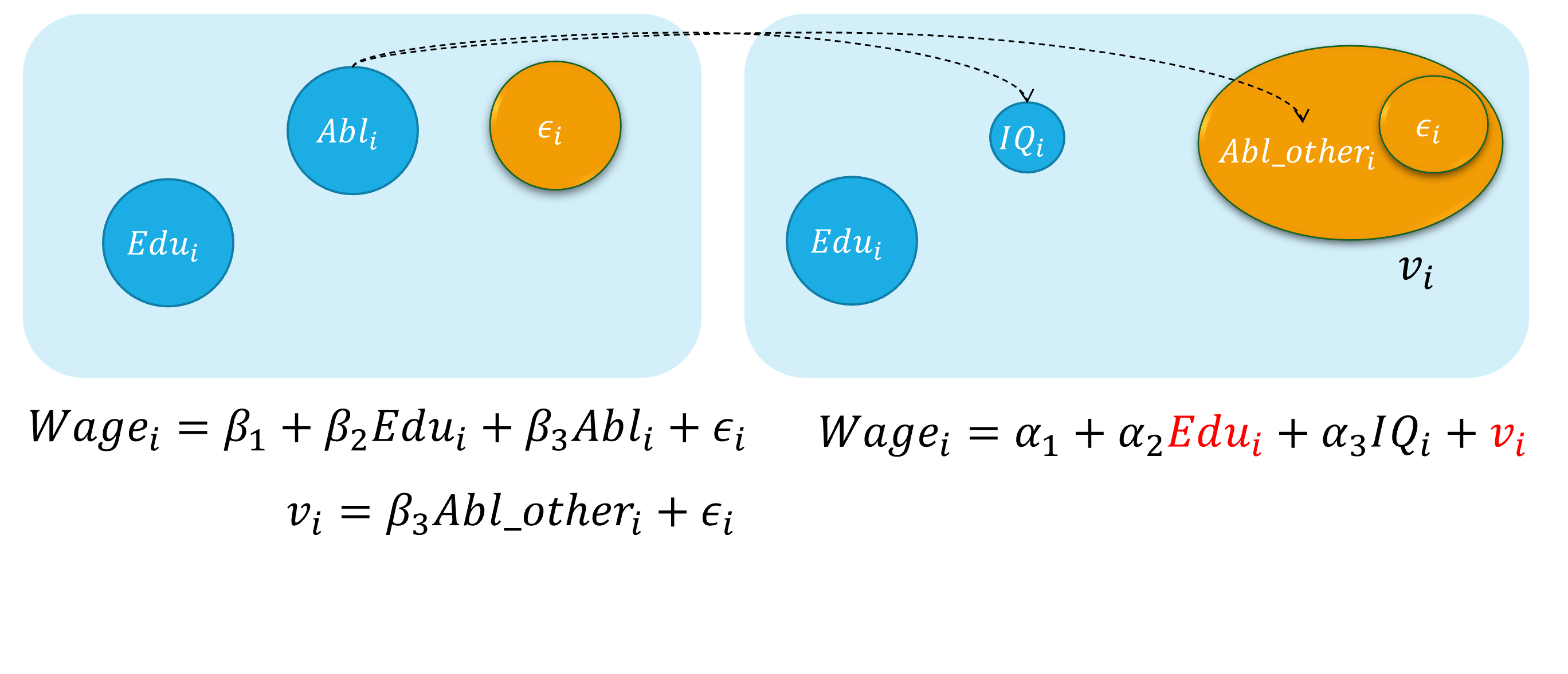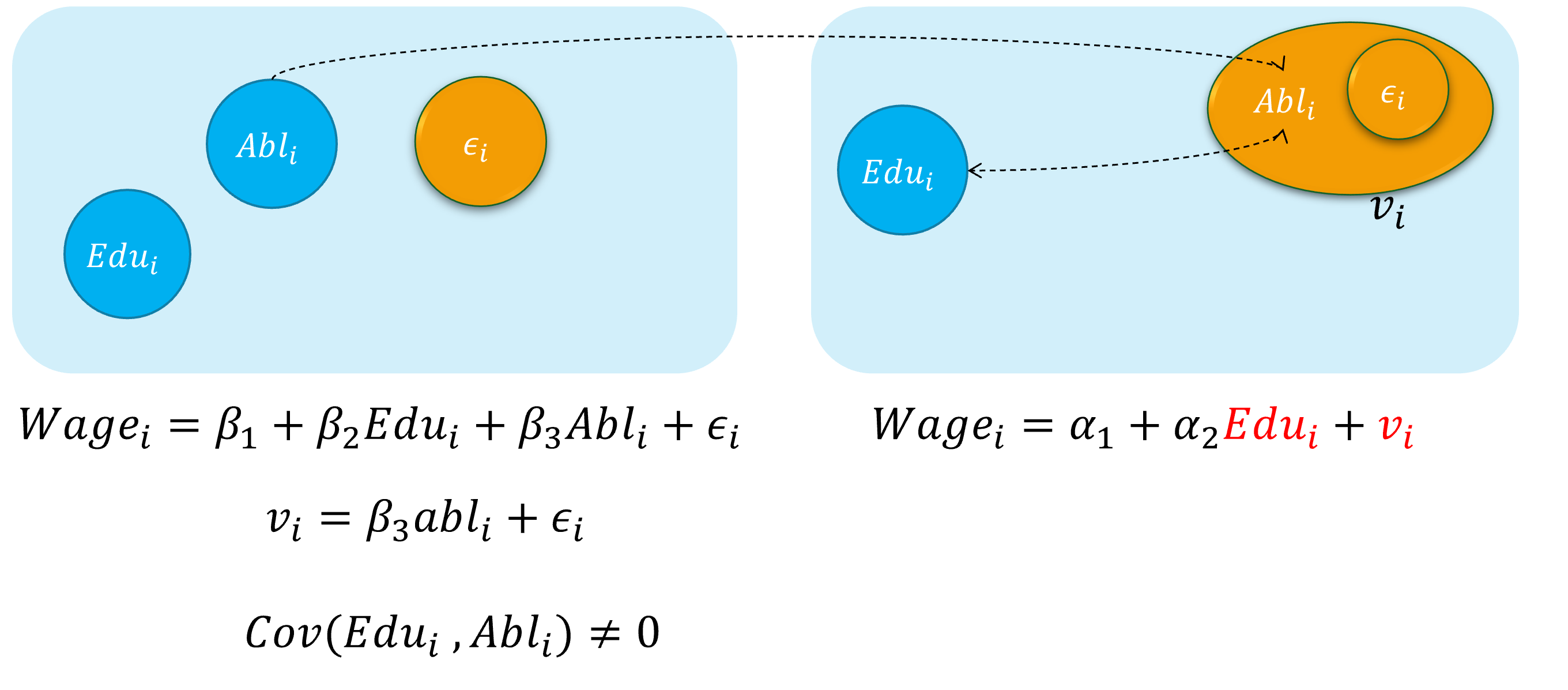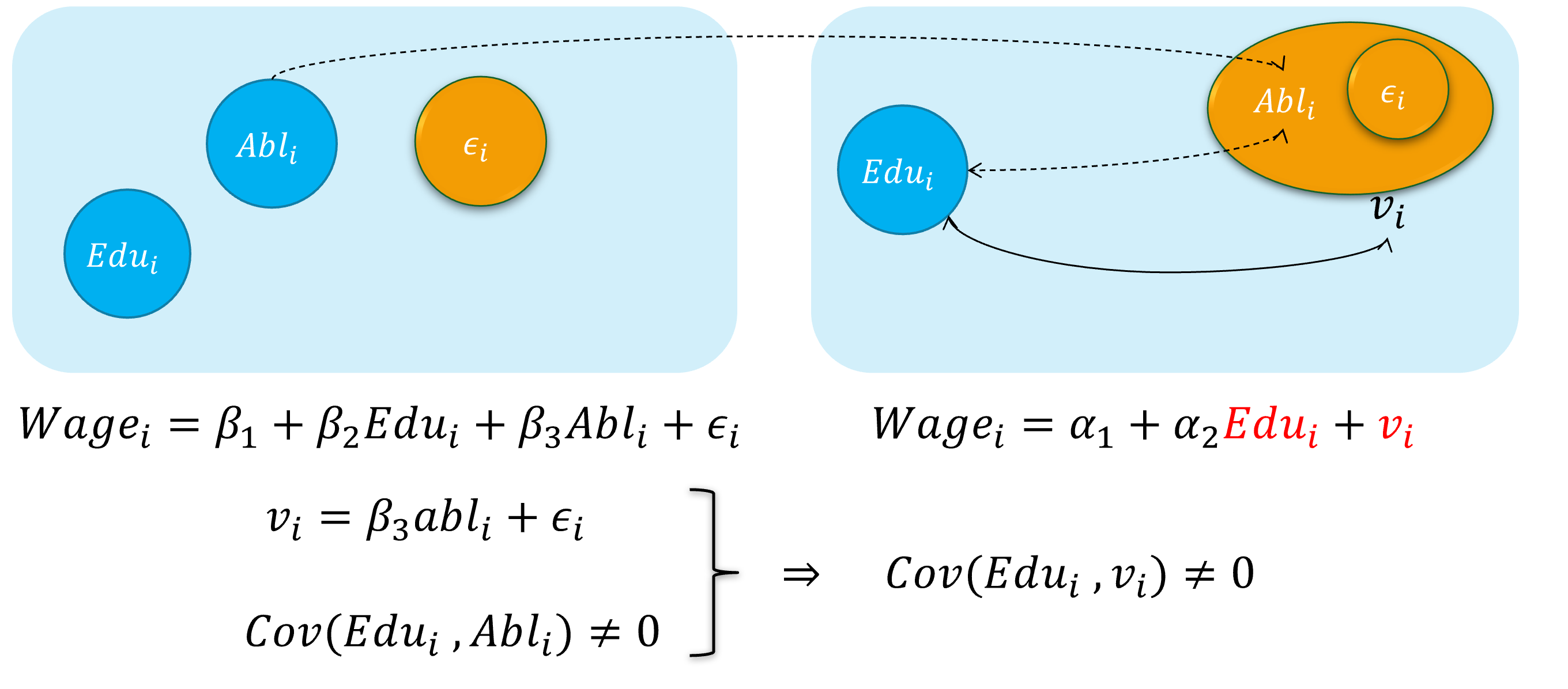 ??? Good evening everyone. Welcome to my class. I am teacher Hu Huaping. Here is my email. You can contact me when you have any questions with our course. In this part, we will learn Simultaneous Equation Models together by using almost eight lessons. --- count: false class: center, middle, duke-orange,hide_logo # Part 2:Simultaneous Equation Models (SEM) .large[ .red[Chapter 17. Endogeneity and Instrumental Variables] Chapter 18. Why Should We Concern SEM ? Chapter 19. What is the Identification Problem ? Chapter 20. How to Estimate SEM ? ] ??? As you see this part contains four chapters. Firstly, we will go through Chapter 17. Regressor Endogeneity problems and instrumental Variables solutions will be discussed in this chapter. Anyway, this chapter will be a good start for learning SEM. The next three chapters focus closely on SEM. We will answer three important questions in turn. In Chapter 18, we will know SEM is important in social science and it also brings new challenges to us. Large SEM system always contains lots of parameters need to be solved and will face with the identification problems. We will give you guides and rules to check the SEM identification status in Chapter 19. Finally, we will discuss different SEM estimation approaches in Chapter 20, including 2SLS, Three-stage least squares (3SLS) and full information maximum likelihood (FIML) method. --- layout: false class: center, middle, duke-softblue,hide_logo name: chapter17 # Chapter 17. Endogeneity and Instumental Variables [17.1 Definition and source of endogeneity](#definition) [17.2 Estimation problem with endogeneity](#problem) [17.3 IV and choices](#IV) [17.4 Two-stage least squares method](#TSLS) [17.5 Testing instrument validity](#validity) [17.6 Testing regressor endogeneity](#endogeneity) ??? [source](https://web.sgh.waw.pl/~mrubas/AdvEcon/pdf/T2_Endogeneity.pdf) So let us start the first chapter. In this chapter: - You will see how the method of **instrumental variables** (IV) can be used to solve the problem of **endogeneity** due to one or more regressors. - Also we will learn the method of **two stage least squares** in section 17.4. 2SLS method is second in popularity only to ordinary least squares for estimating linear equations in econometrics. - And some useful testing techniques will be introduced to check instrument validity and regressor endogeneity. These content will be uncovered in the last two sections. --- layout: false class: center, middle, duke-softblue,hide_logo name: definition ## 17.1 Definition and sources of endogeneity ??? In this section we will talk about the definition of endogeneity and its main sources. The story begins with the stochastic regressors. --- layout: true <div class="my-header-h2"></div> <div class="watermark1"></div> <div class="watermark2"></div> <div class="watermark3"></div> <div class="my-footer"><span>huhuaping@ <a href="#chapter17"> Chapter 17. Endogeneity and Instumental Variables |</a>               <a href="#definition"> 17.1 Definition and source of endogeneity </a> </span></div> --- ### Review: the CLRM assumptions Let's revise the classic linear regression model assumptions(CLRM): - **A1**: The true model is `\(\boldsymbol{y= X \beta+\epsilon}\)`. - **A2**: `\(\forall i, E(\epsilon_i|X) = 0\)` (conditional zero mean) more about this later. - **A3**: `\(Var(\epsilon|X) = E(\epsilon \epsilon^{\prime}|X) = \sigma^2I\)` (identical conditional variance ). - **A4**: `\(\boldsymbol{X}\)` has full column rank. - **A5**: (for inference purposes, `\(\boldsymbol{\epsilon} \sim N(\boldsymbol{0}, σ^2\boldsymbol{I}))\)`. Under **A1-A4**(also namely **CLRM**), the OLS is **Gauss-Markov** efficient. Under **A1-A5**, we donote **N-CLRM**. ??? we have discussed these assumptions before the class. And we denote the Gauss-Markov model assumption system as classical linear regression model (CLRM). - **Assumption 1**: The model is assumed to be true and be linear with parameters. - **Assumption 2**: the disturbance term has conditional zero expectation. And we will relax this assumption later. - **Assumption 3**: this means the conditional variance of disturcances is identity given X. the other way to express assumption 3 is that the disturbance term is homoscedasticity['hɔməusi,dæs'tisəti]. - **Assumption 4**: The regressor matrix X has full column rank. Which means that none of the regressors is the perfect linear function on the rest of the regressors. - **Assumption 5**: We will bring in the norm distribution assumption on the disburtance. This assumption aims for hypothesis testing purposes. Joint with A2, A3, and A5, the disturbance is assumed to be normally identical independent distribution. We just write i.i.d for shortly. With assumptions **A1-A4**, We note **CLRM**. Under CLRM the OLS is **Gauss-Markov** efficient. Which means under CLRM, when we use OLS method we will obtain the Best-Linear-unbiased estimators on the true parameters. [hand writing] While, with assumptions **A1-A5**, we used to denote as N-CLRM. we can conduct kinds of inference and tests based on N-CLRM. Now let us focus on assumption 2. --- ### Review: the A2 assumptions For the population regression model(PRM): `$$\begin{align} Y_i &= \beta_1 +\beta_2X_i + u_i && \text{(PRM)} \end{align}$$` - **CLRM A2** assumes that X is fixed (given) or independent of the error term. The regressors `\(X\)` **are not** random variables. At this point, we can use the OLS method and get **BLUE**(Best Linear Unbiased Estimator). `$$\begin{align} Cov(X_i, u_i)= 0; \quad E(X_i u_i)= 0 \end{align}$$` - If the above A2 assumption is violated, the independent variable `\(X\)` is related to the random disturbance term. In this case, OLS estimation will no longer get **BLUE**, and **instrumental variable method** (IV) should be used for estimation. `$$\begin{align} Cov(X_i, u_i) \neq 0 ; \quad E(X_i u_i) \neq 0 \end{align}$$` ??? If A2 is violated, then the endogeneity problem arise. Now we