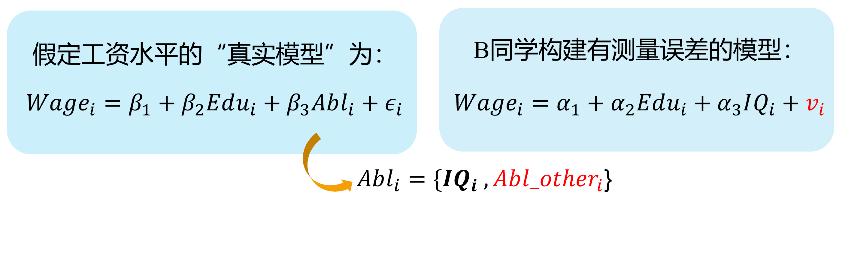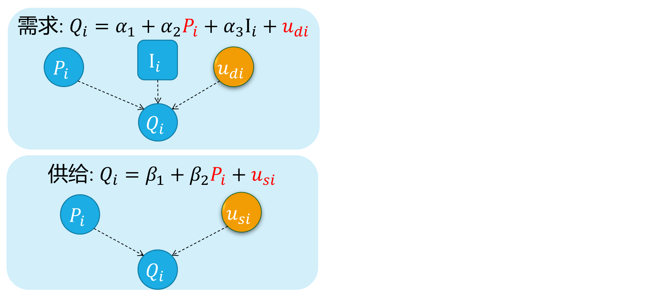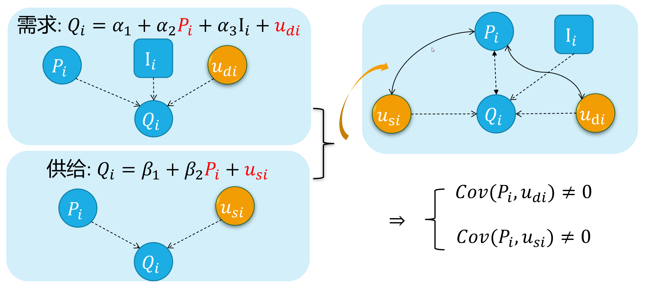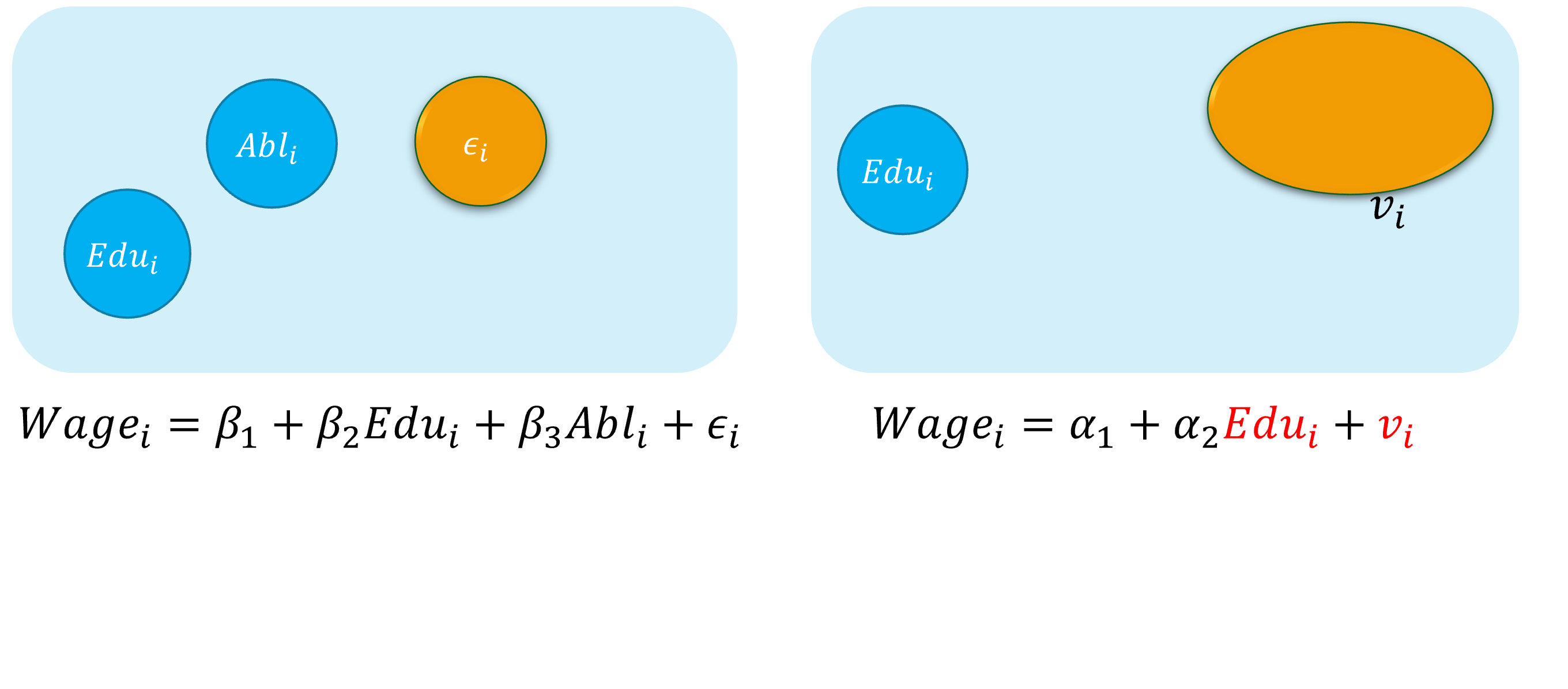 ??? Good evening everyone. Welcome to my class. I am teacher Hu Huaping. Here is my email. You can contact me when you have any questions with our course. In this part, we will learn Simultaneous Equation Models together by using almost eight lessons. --- count: false class: center, middle, duke-orange,hide_logo # Part 2:Simultaneous Equation Models (SEM) .large[ .red[Chapter 17. Endogeneity and Instrumental Variables] Chapter 18. Why Should We Concern SEM ? Chapter 19. What is the Identification Problem ? Chapter 20. How to Estimate SEM ? ] ??? As you see this part contains four chapters. Firstly, we will go through Chapter 17. Regressor Endogeneity problems and instrumental Variables solutions will be discussed in this chapter. Anyway, this chapter will be a good start for learning SEM. The next three chapters focus closely on SEM. We will answer three important questions in turn. In Chapter 18, we will know SEM is important in social science and it also brings new challenges to us. Large SEM system always contains lots of parameters need to be solved and will face with the identification problems. We will give you guides and rules to check the SEM identification status in Chapter 19. Finally, we will discuss different SEM estimation approaches in Chapter 20, including 2SLS, Three-stage least squares (3SLS) and full information maximum likelihood (FIML) method. --- layout: false class: center, middle, duke-softblue,hide_logo name: chapter17 # Chapter 17. Endogeneity and Instumental Variables [17.1 Definition and source of endogeneity](#definition) [17.2 Estimation problem with endogeneity](#problem) [17.3 IV and choices](#IV) [17.4 Two-stage least squares method](#TSLS) [17.5 Testing instrument validity](#validity) [17.6 Testing regressor endogeneity](#endogeneity) ??? [source](https://web.sgh.waw.pl/~mrubas/AdvEcon/pdf/T2_Endogeneity.pdf) So let us start the first chapter. In this chapter: - You will see how the method of **instrumental variables** (IV) can be used to solve the problem of **endogeneity** due to one or more regressors. - Also we will learn the method of **two stage least squares** in section 17.4. 2SLS method is second in popularity only to ordinary least squares for estimating linear equations in econometrics. - And some useful testing techniques will be introduced to check instrument validity and regressor endogeneity. These content will be uncovered in the last two sections. --- layout: false class: center, middle, duke-softblue,hide_logo name: definition ## 17.1 Definition and sources of endogeneity ??? In this section we will talk about the definition of endogeneity and its main sources. The story begins with the stochastic regressors. --- layout: true <div class="my-header-h2"></div> <div class="watermark1"></div> <div class="watermark2"></div> <div class="watermark3"></div> <div class="my-footer"><span>huhuaping@ <a href="#chapter17"> Chapter 17. Endogeneity and Instumental Variables |</a>               <a href="#definition"> 17.1 Definition and source of endogeneity </a> </span></div> --- ### Review: the CLRM assumptions Let's revise the classic linear regression model assumptions(CLRM): - **A1**: The true model is `\(\boldsymbol{y= X \beta+\epsilon}\)`. - **A2**: `\(\forall i, E(\epsilon_i|X) = 0\)` (conditional zero mean) more about this later. - **A3**: `\(Var(\epsilon|X) = E(\epsilon \epsilon^{\prime}|X) = \sigma^2I\)` (identical conditional variance ). - **A4**: `\(\boldsymbol{X}\)` has full column rank. - **A5**: (for inference purposes, `\(\boldsymbol{\epsilon} \sim N(\boldsymbol{0}, σ^2\boldsymbol{I}))\)`. Under **A1-A4**(also namely **CLRM**), the OLS is **Gauss-Markov** efficient. Under **A1-A5**, we donote **N-CLRM**. ??? we have discussed these assumptions before the class. And we denote the Gauss-Markov model assumption system as classical linear regression model (CLRM). - **Assumption 1**: The model is assumed to be true and be linear with parameters. - **Assumption 2**: the disturbance term has conditional zero expectation. And we will relax this assumption later. - **Assumption 3**: this means the conditional variance of disturcances is identity given X. the other way to express assumption 3 is that the disturbance term is homoscedasticity['hɔməusi,dæs'tisəti]. - **Assumption 4**: The regressor matrix X has full column rank. Which means that none of the regressors is the perfect linear function on the rest of the regressors. - **Assumption 5**: We will bring in the norm distribution assumption on the disburtance. This assumption aims for hypothesis testing purposes. Joint with A2, A3, and A5, the disturbance is assumed to be normally identical independent distribution. We just write i.i.d for shortly. With assumptions **A1-A4**, We note **CLRM**. Under CLRM the OLS is **Gauss-Markov** efficient. Which means under CLRM, when we use OLS method we will obtain the Best-Linear-unbiased estimators on the true parameters. [hand writing] While, with assumptions **A1-A5**, we used to denote as N-CLRM. we can conduct kinds of inference and tests based on N-CLRM. Now let us focus on assumption 2. --- ### Review: the A2 assumptions For the population regression model(PRM): `$$\begin{align} Y_i &= \beta_1 +\beta_2X_i + u_i && \text{(PRM)} \end{align}$$` - **CLRM A2** assumes that X is fixed (given) or independent of the error term. The regressors `\(X\)` **are not** random variables. At this point, we can use the OLS method and get **BLUE**(Best Linear Unbiased Estimator). `$$\begin{align} Cov(X_i, u_i)= 0; \quad E(X_i u_i)= 0 \end{align}$$` - If the above A2 assumption is violated, the independent variable `\(X\)` is related to the random disturbance term. In this case, OLS estimation will no longer get **BLUE**, and **instrumental variable method** (IV) should be used for estimation. `$$\begin{align} Cov(X_i, u_i) \neq 0 ; \quad E(X_i u_i) \neq 0 \end{align}$$` ??? If A2 is violated, then the endogeneity problem arise. Now we